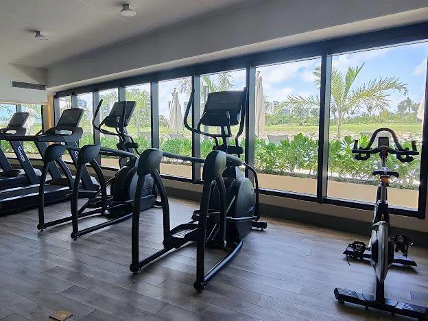 The extensive list of shared amenities includes a marina, an adult lounge, a sundeck, a playroom, a yoga room, gardens, a gym, a spa, palapas, a sand volleyball court, a padel court, a restaurant, three swimming pools, a swimming lane, a bar, and a business center.