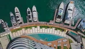 Resident amenities include a lobby with concierge service, an events salon, a private marina with 20 yacht positions, direct access to a beach club, a spa and wellness center, a fully equipped gym, a suspended swimming pool between the 10th and 11th floors, an infinity pool with a deck, a paddle tennis court, access to an 18-hole, par 72 golf course, a meeting room, a children's workshop, and a dedicated lab space.