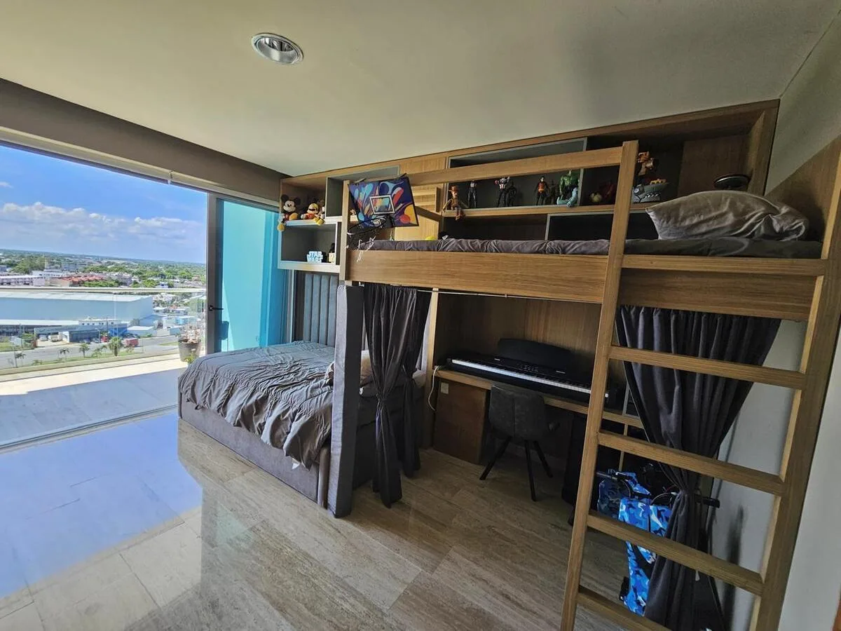The building offers a comprehensive suite of amenities. These include swimming pools, a splash pool, a sand play area, a children's playground, and a palapa with a barbecue grill. Additional building amenities consist of a cinema room, a gym, a playroom, billiard rooms, an adult-only pool, and a basketball court.