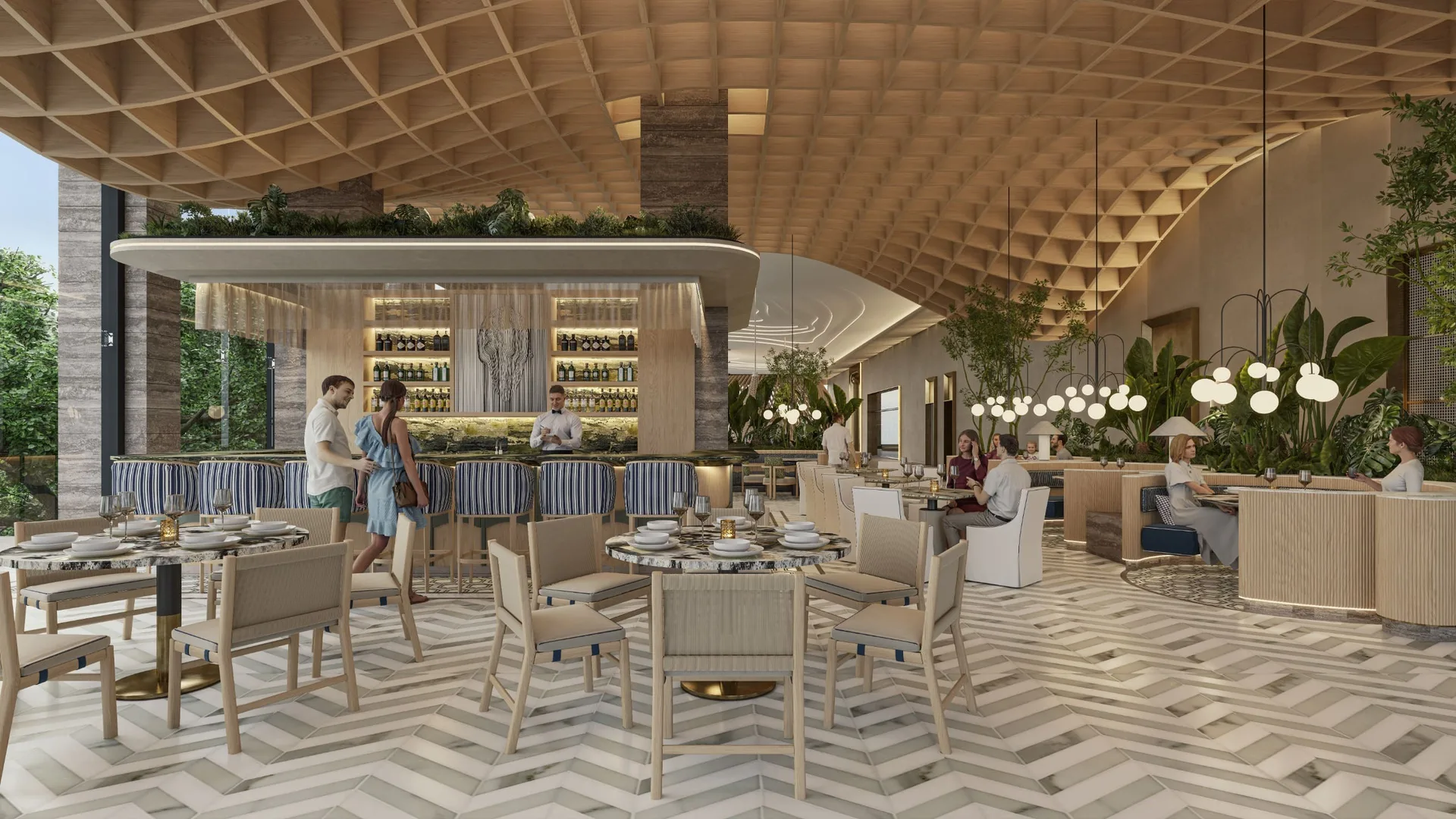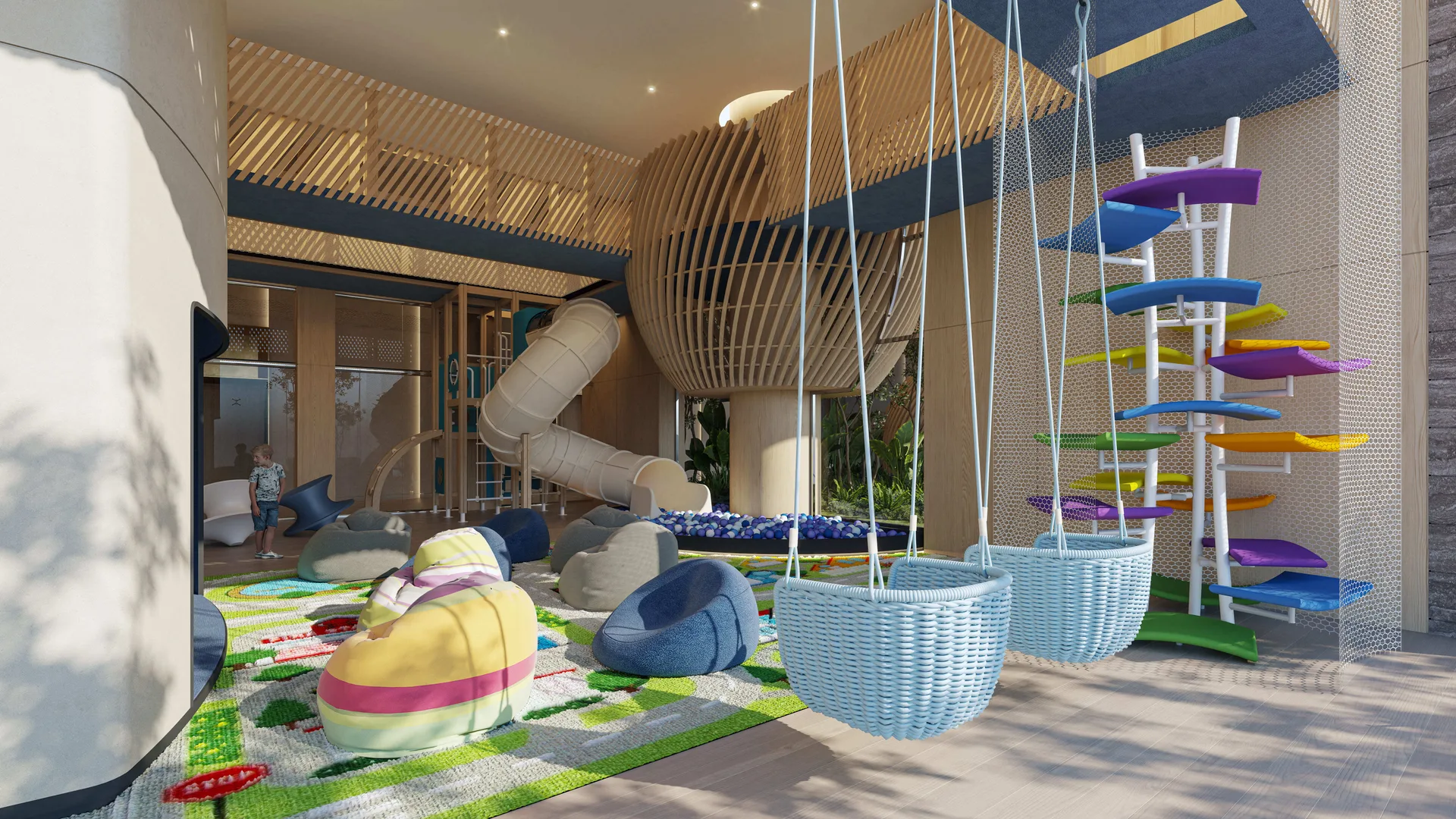 The residential building offers a wide array of amenities such as a family pool, children's pool, hammock area, spa center, and a pet-friendly space. Sports facilities include rowing and tennis courts, as well as mini golf. Additional features include a piano bar, coworking area, music room, children's club, teen club, and an arcade.