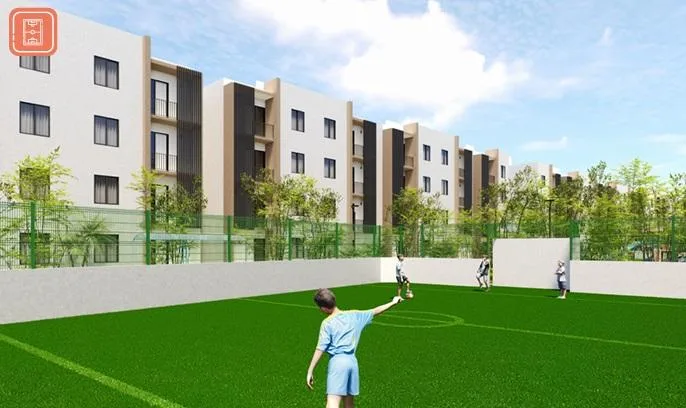 The residential complex offers extensive amenities including pools with a splash pad, sun decks, a fast soccer field, a barbecue area, a jogging track, a calisthenics area, a yoga space, a climate-controlled gym, and a children's play area.