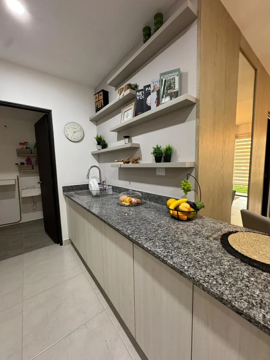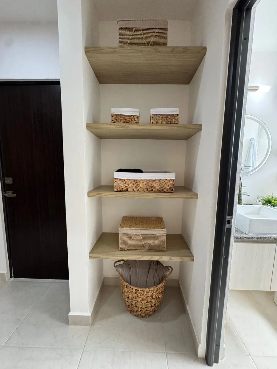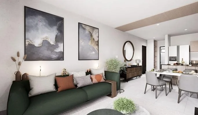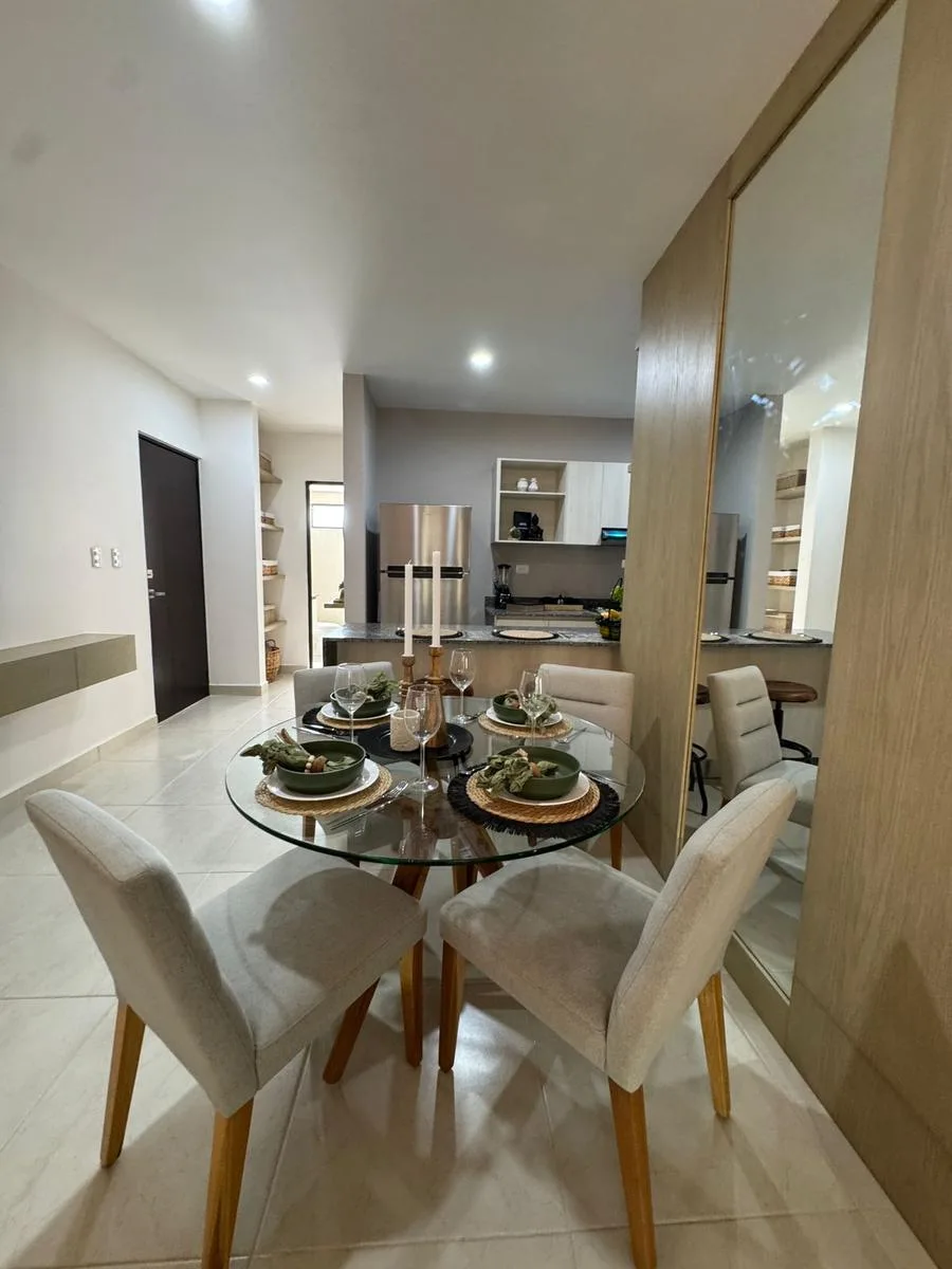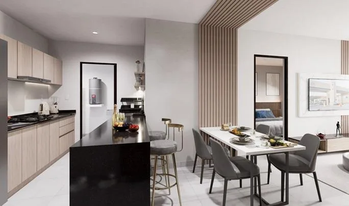 This modern apartment in Cancún features a functional layout with a spacious living-dining room, an equipped kitchen, a service area, two bedrooms, and two full bathrooms. The primary bedroom includes a full bathroom and space for a walk-in closet.
