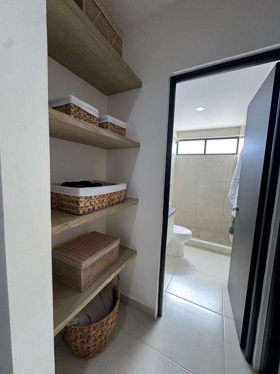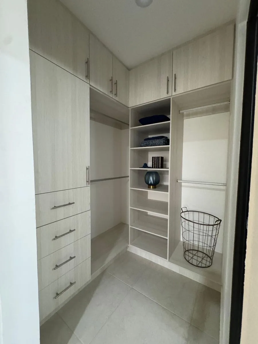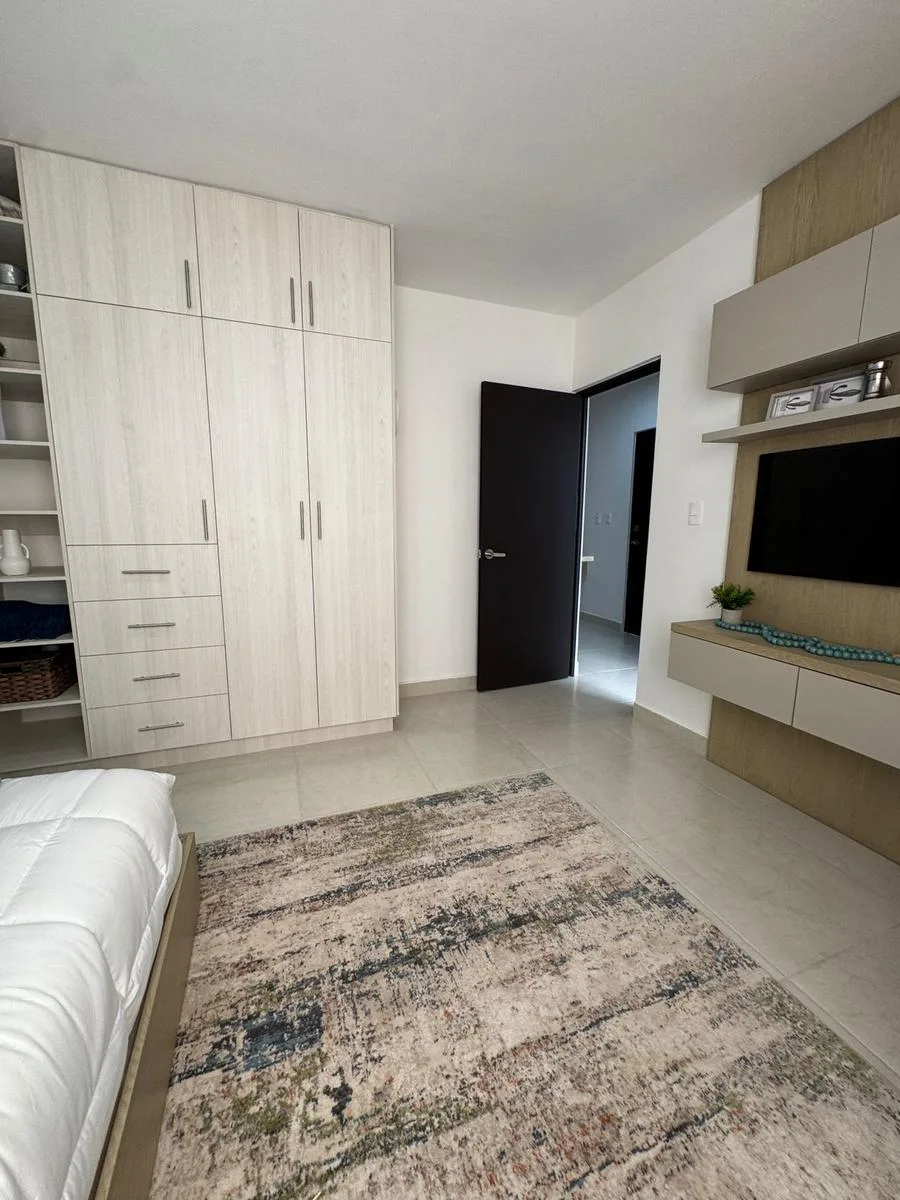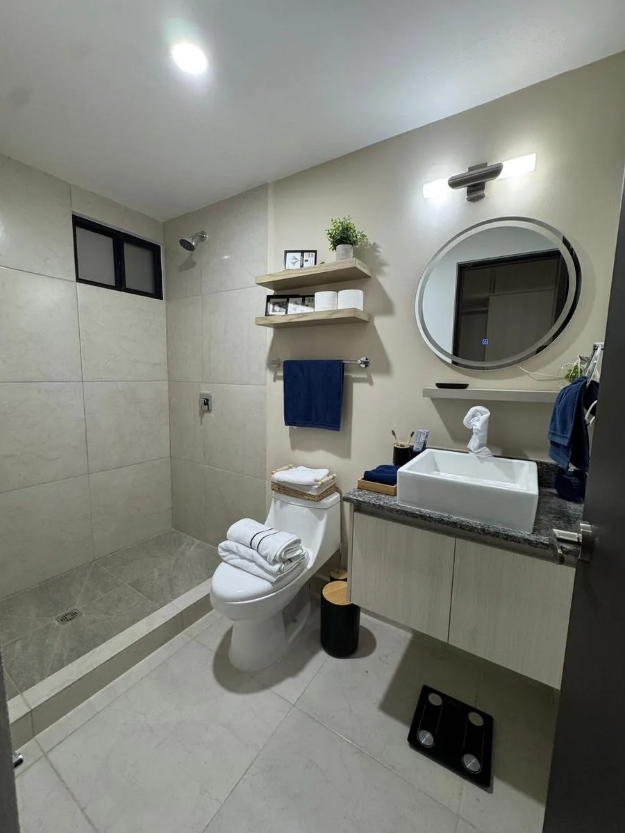 This modern apartment in Cancún features a functional layout with a spacious living-dining room, an equipped kitchen, a service area, two bedrooms, and two full bathrooms. The primary bedroom includes a full bathroom and space for a walk-in closet.
