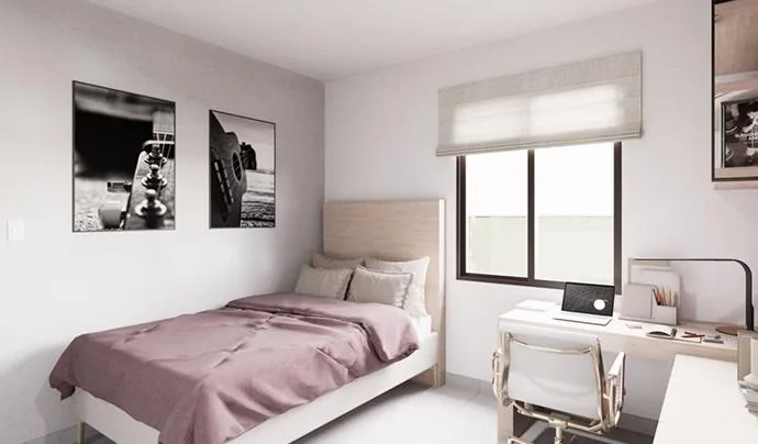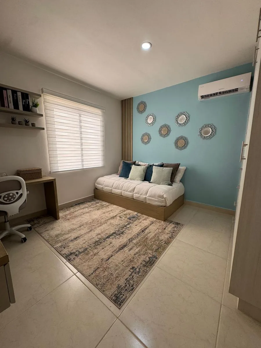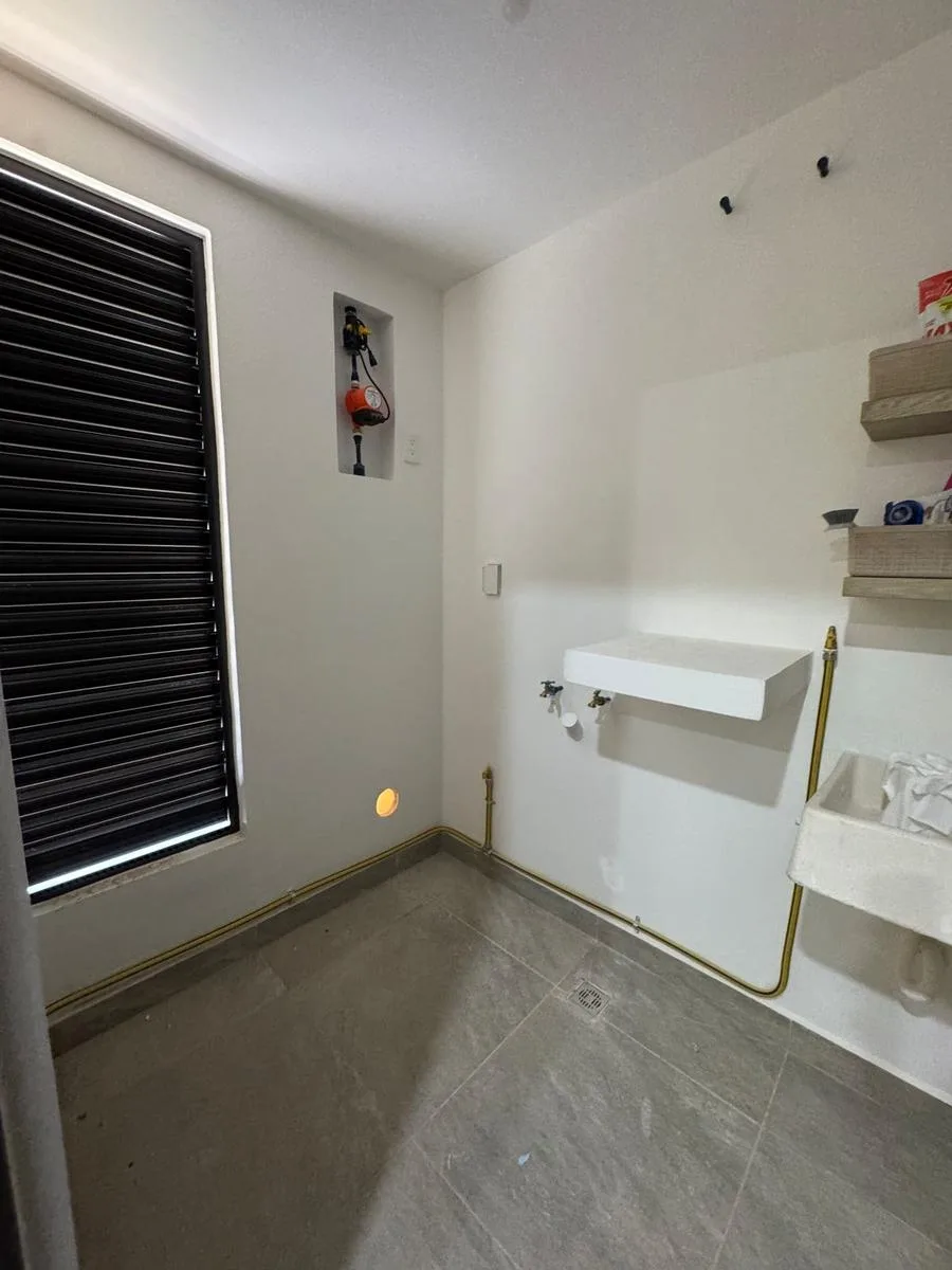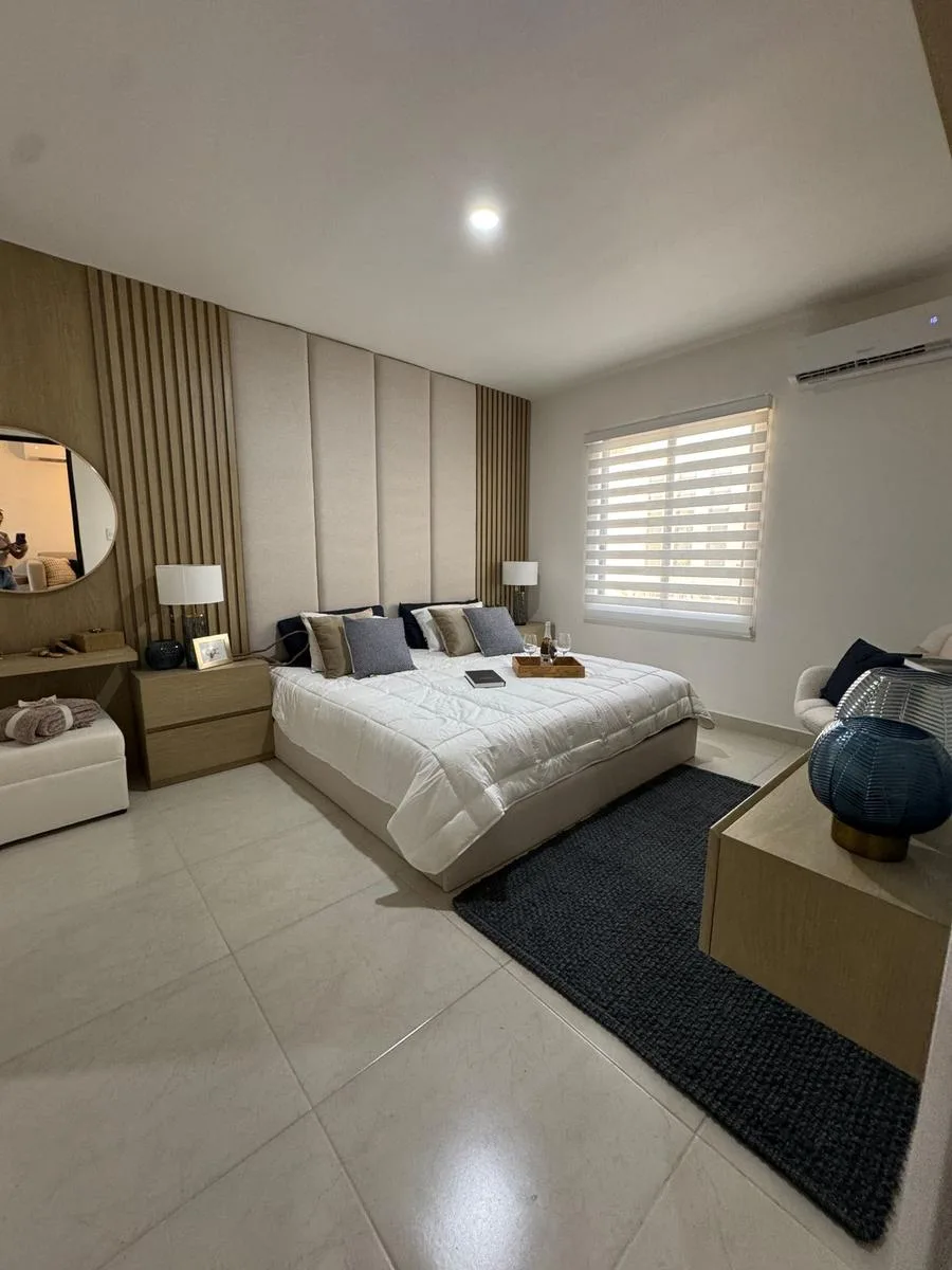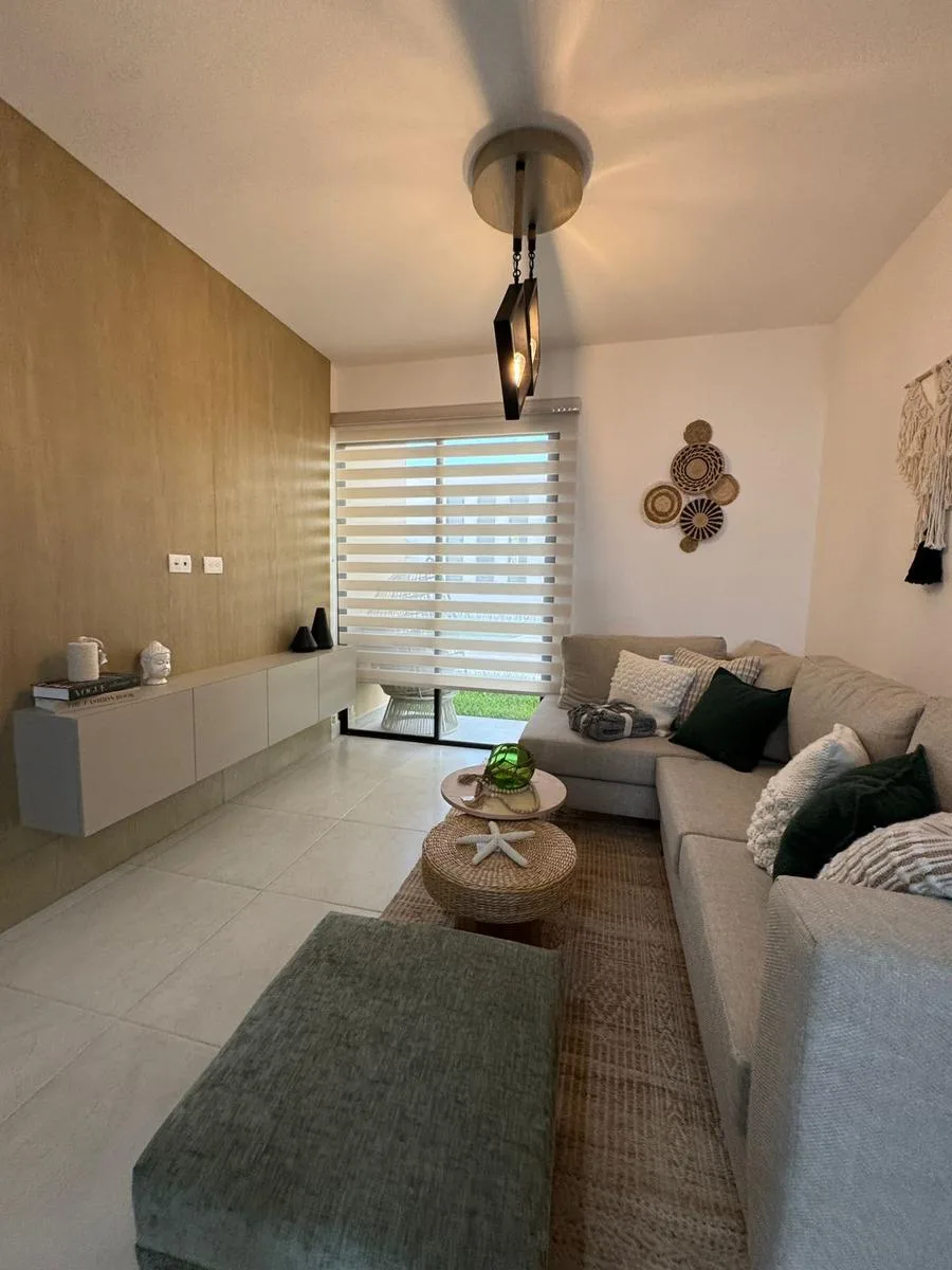 This modern apartment in Cancún features a functional layout with a spacious living-dining room, an equipped kitchen, a service area, two bedrooms, and two full bathrooms. The primary bedroom includes a full bathroom and space for a walk-in closet.