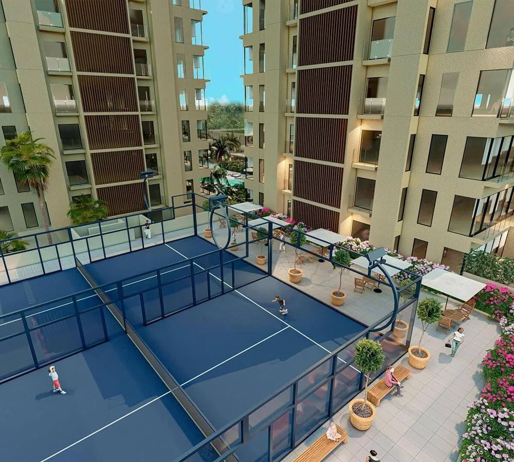 The residential complex offers a wide array of amenities for residents. These include a swimming pool, a bowling alley, a cinema, a gym, and a yoga area. Recreational facilities consist of a paddle tennis court and a dedicated cycling path. The property provides secure, gated access with a security booth and includes parking.