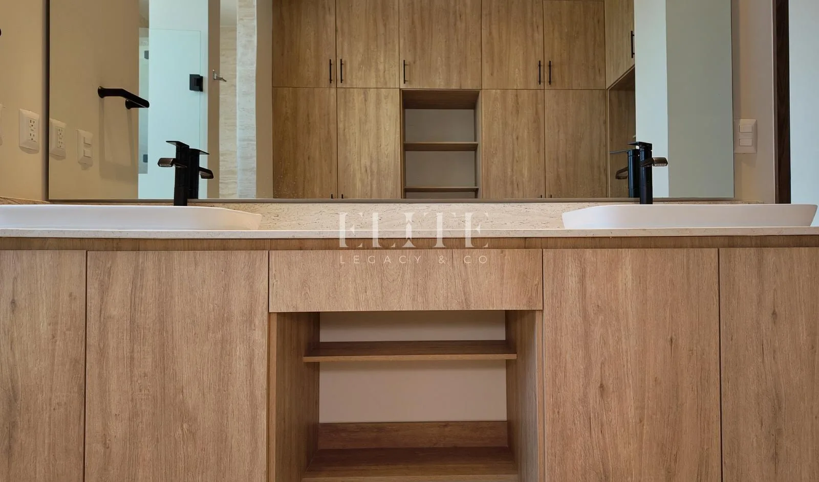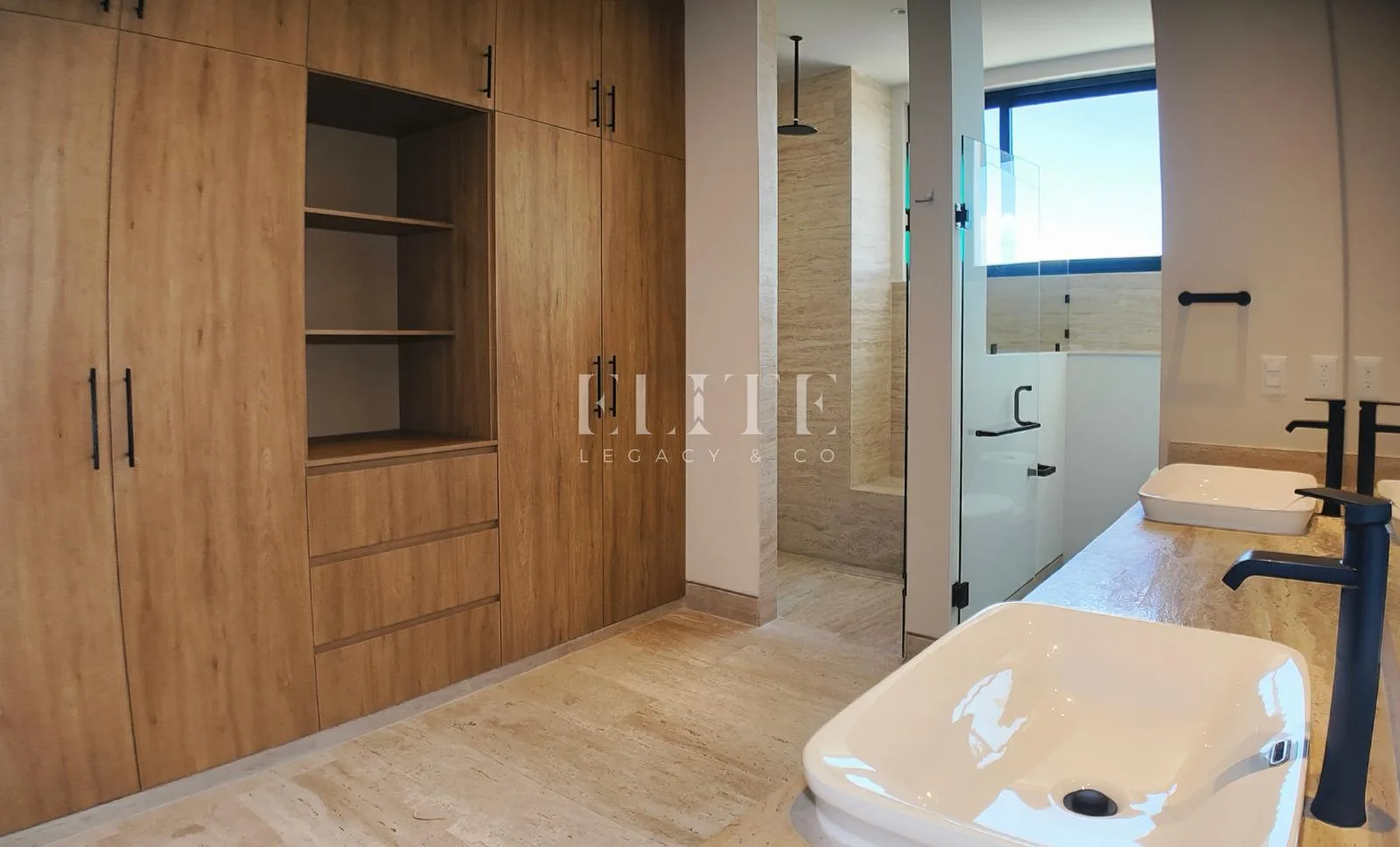 The first level of the unit comprises a living and dining room, an equipped integral kitchen, a pantry, and a complete bathroom for guests and secondary bedroom use. A large terrace provides views of the Nichupté lagoon. There are three bedrooms, each with a closet and en-suite bathroom. Additionally, there is a laundry room, a service room, a service entrance, and covered parking for two cars.