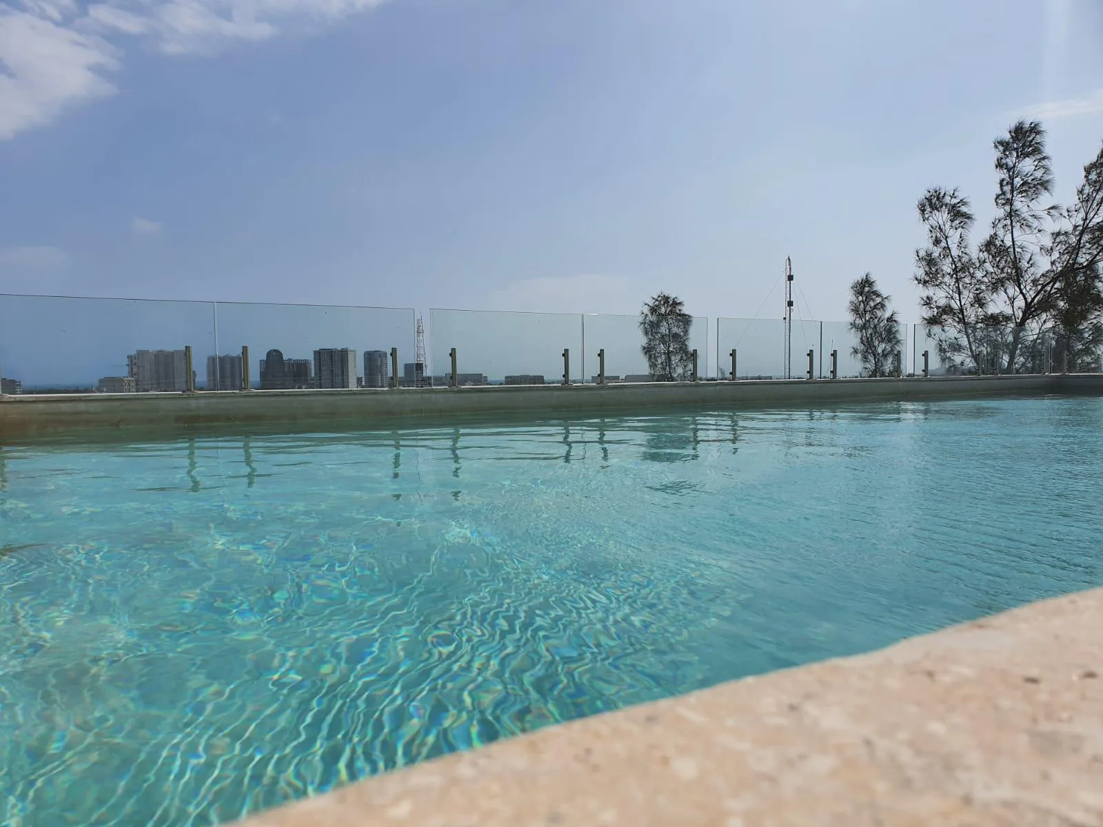 The building features an exclusive rooftop with a spectacular swimming pool and a sundeck terrace, perfect for socializing and enjoying impressive sunsets. A barbecue grill area complements the rooftop experience. From the rooftop, residents can enjoy impressive panoramic views of the lagoon.