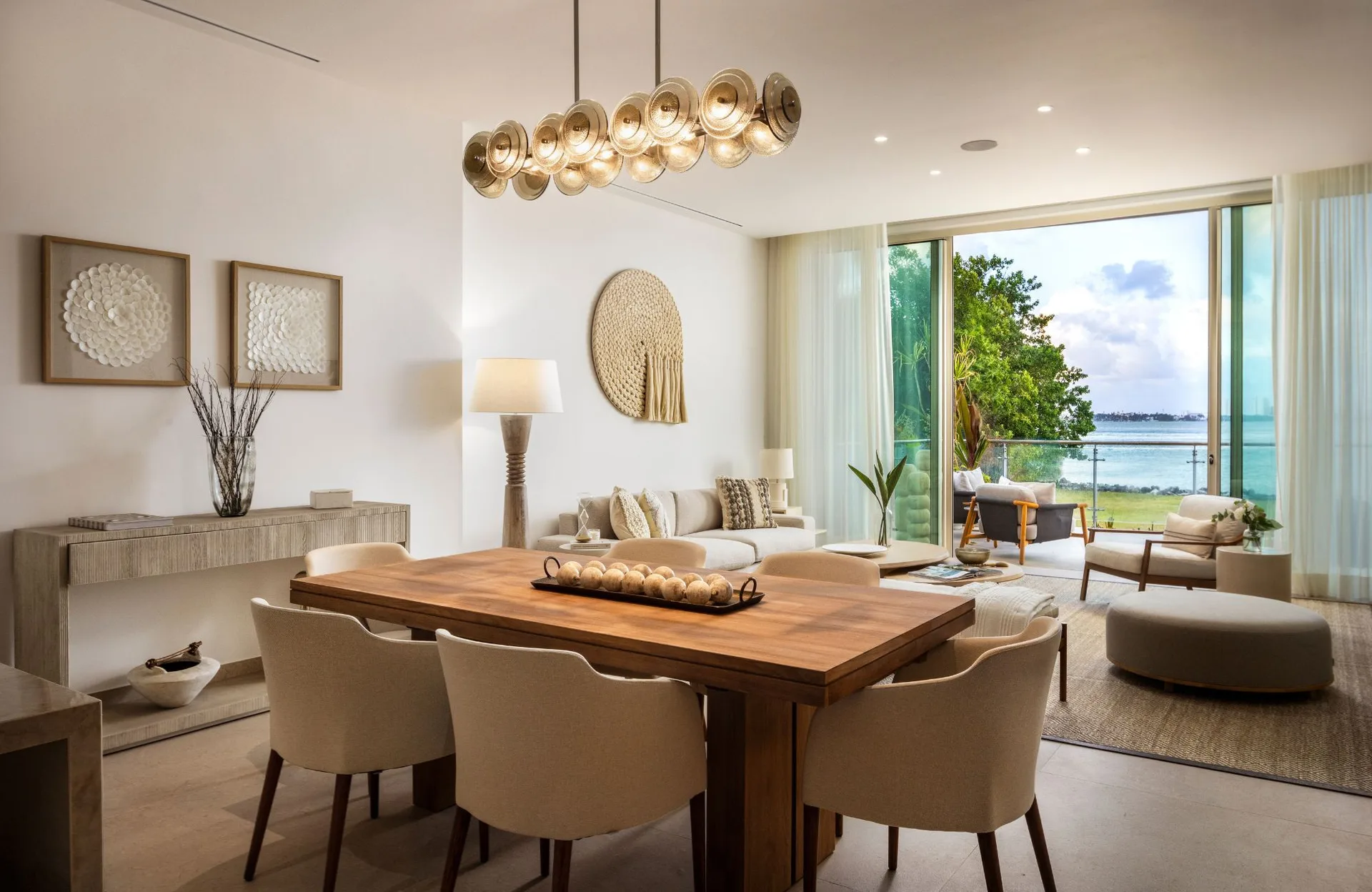 The apartment features panoramic views of the lagoon and sea, with floor-to-ceiling windows that fill the space with natural light. A private terrace provides water views. The design is contemporary with luxury finishes, and private parking is included.