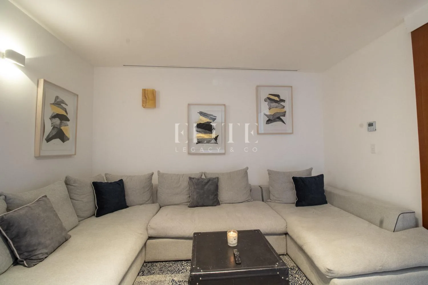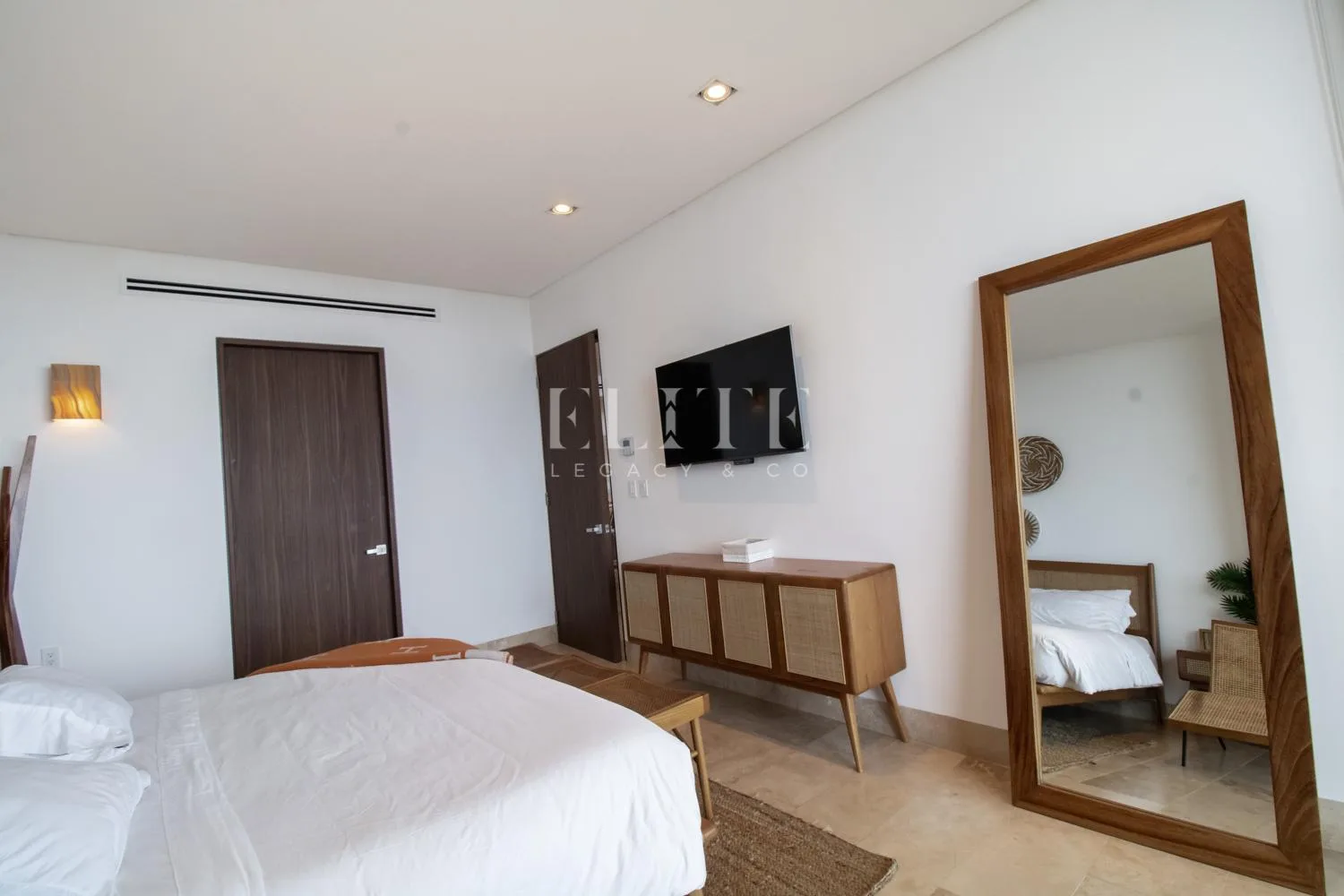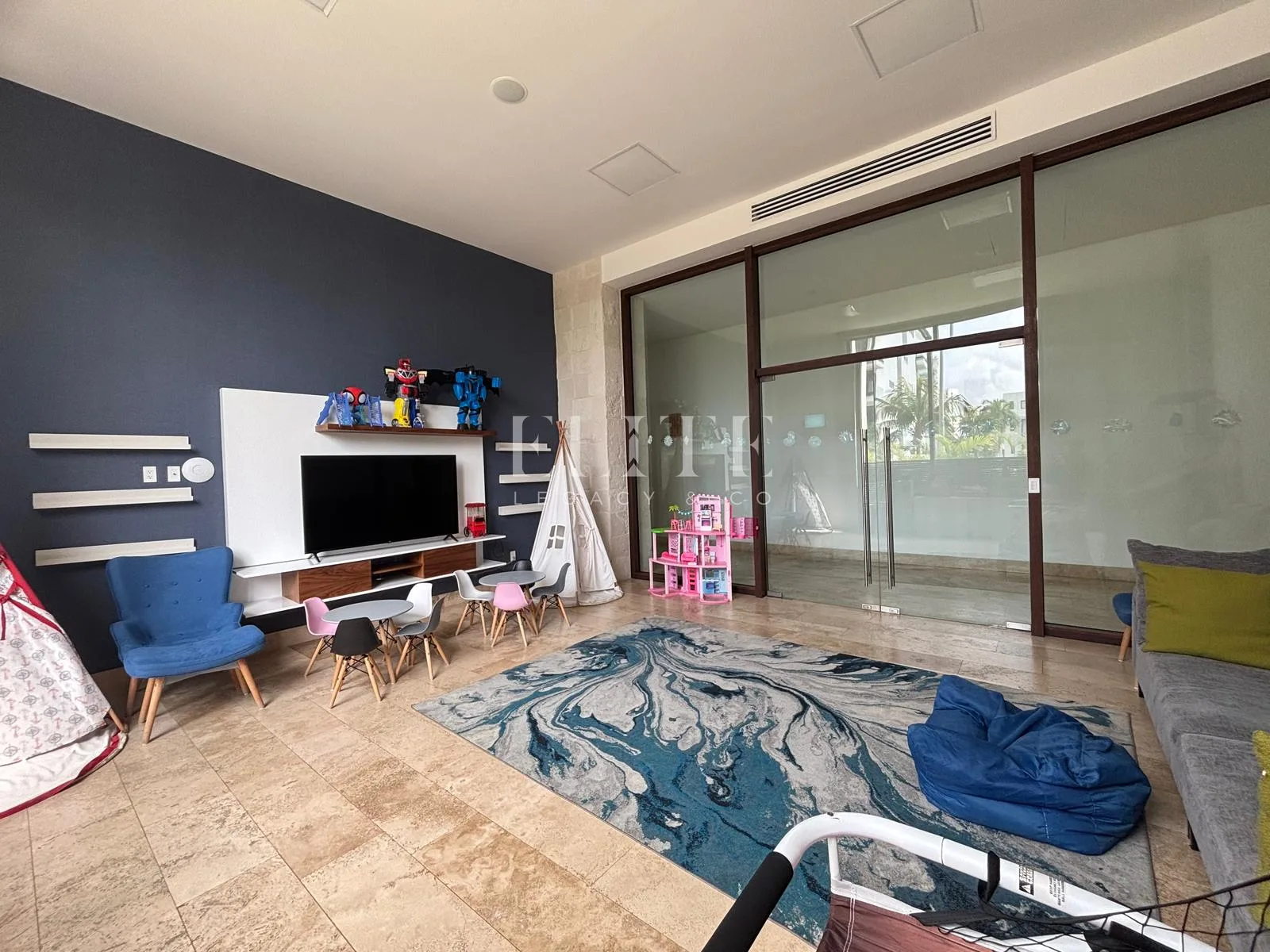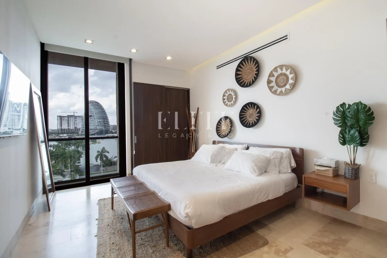 A terrace with outdoor furniture provides a beautiful view. The primary bedroom features a spacious walk-in closet and a private bathroom, with direct access to the terrace. There is a separate, well-equipped television area.