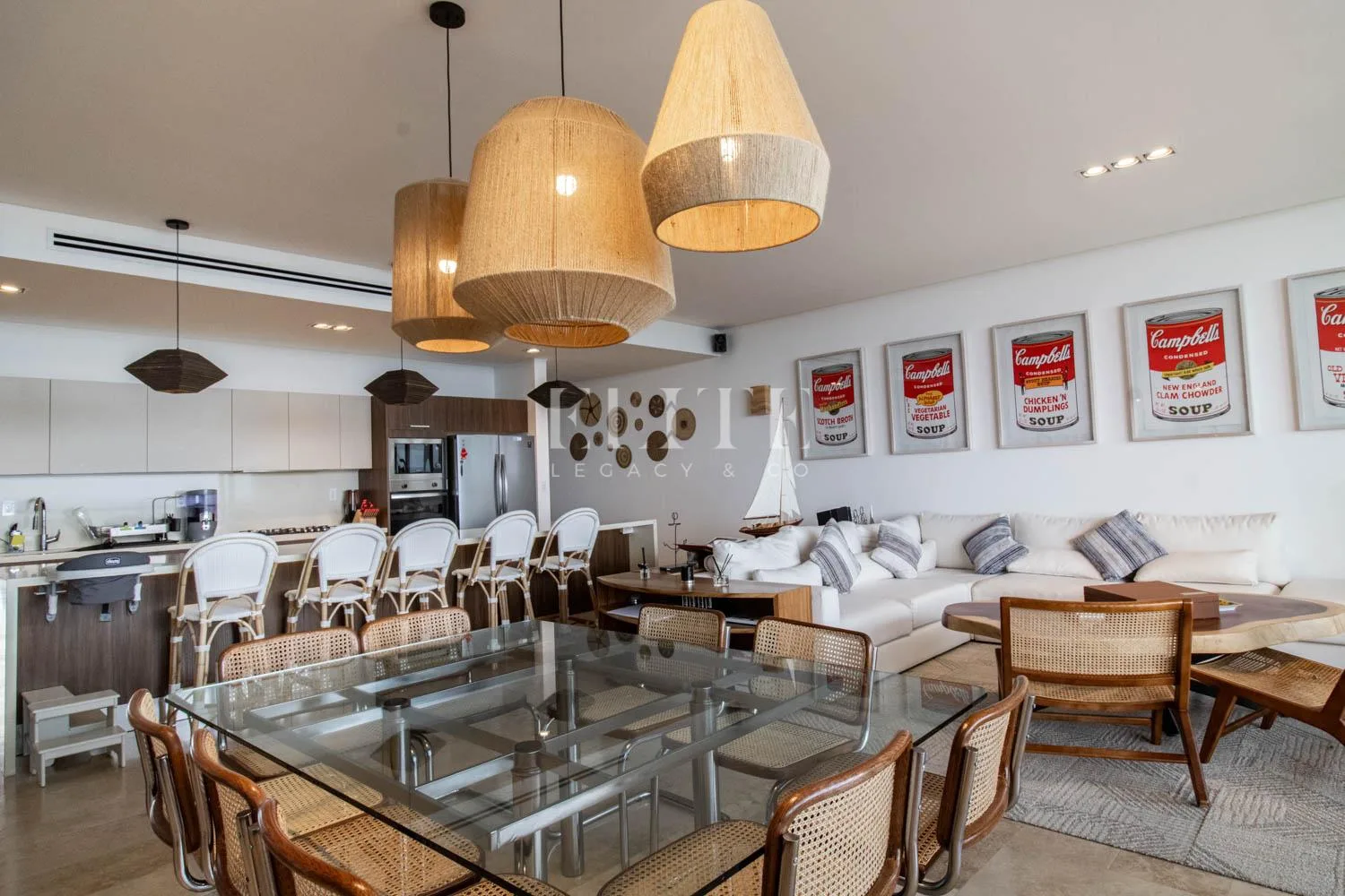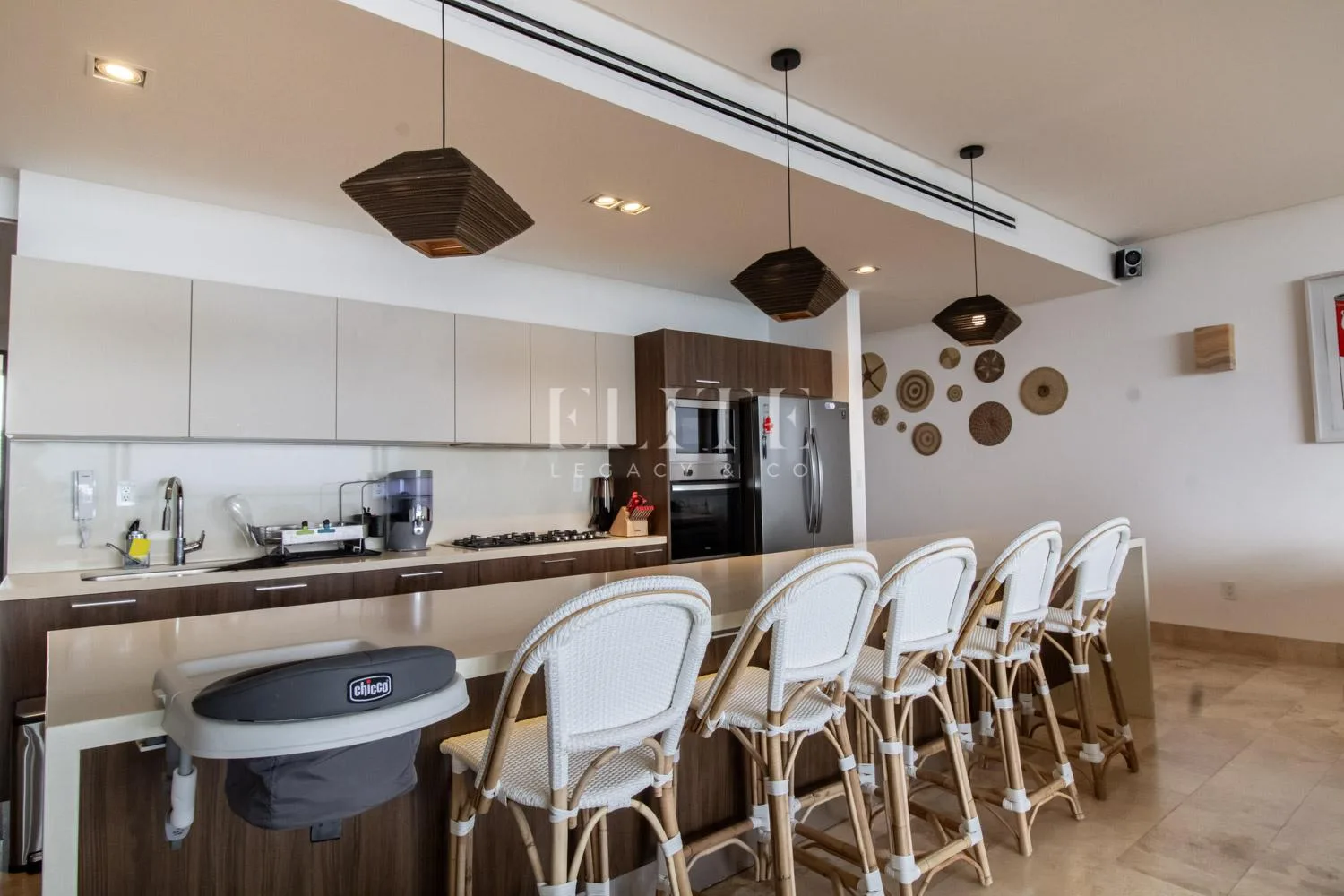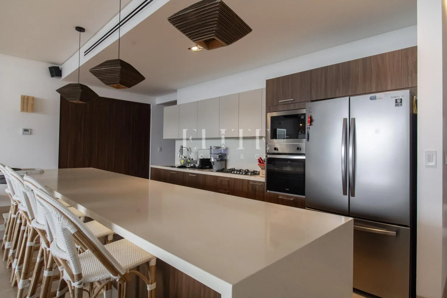 The apartment is a corner unit on the fifth floor, offering a beautiful view of the Caribbean Sea. It is fully furnished and equipped. The layout includes an entry foyer leading to a spacious living and dining area for eight people. The kitchen is fully equipped with an integral design and a generous breakfast bar.