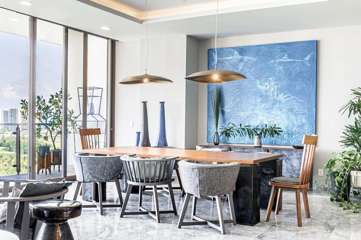 The residence offers a fully integrated living room, dining area, and kitchen, all with views. A terrace connects these spaces to the main bedroom.