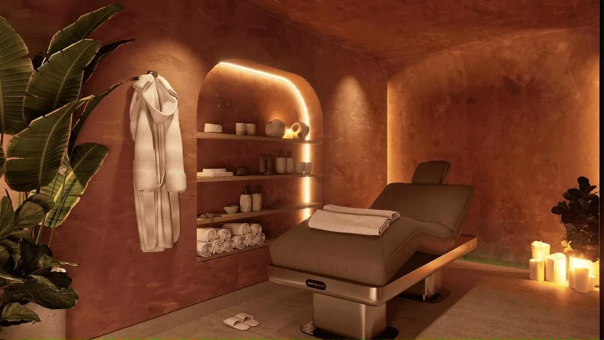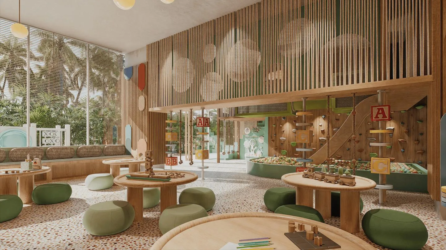 Building amenities include a beach club, a private marina, a pool area with a panoramic terrace, and a wellness space with a gym, spa, and cold plunge. Additional spaces consist of a meeting room, a playroom, and a cinema. There is a playground, a bar, and a pet garden. Covered parking, security, and additional services are available.