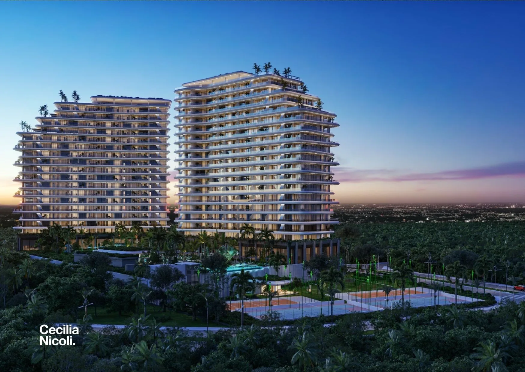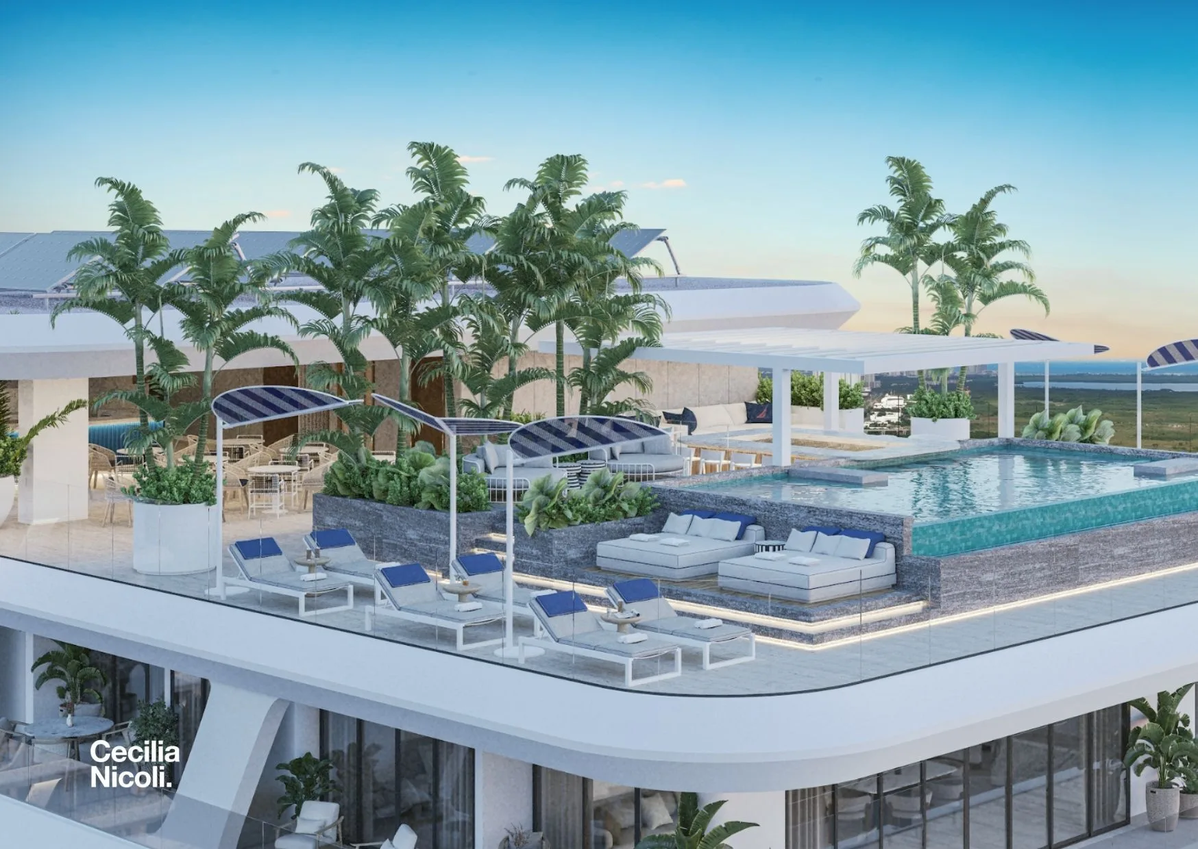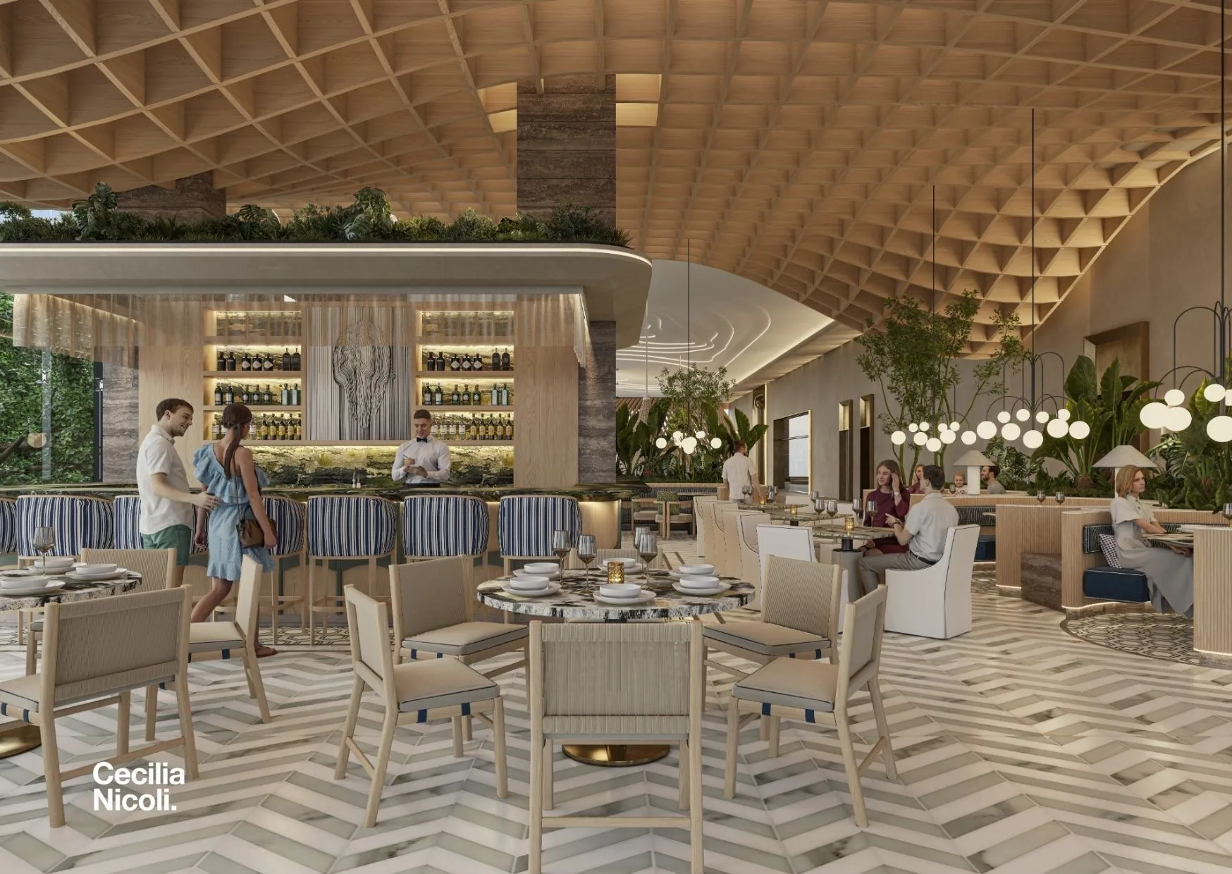 The property provides access to over fifty exclusive amenities. These include a Beach Club on Isla Blanca, sports courts, family swimming pools, and adult-only rooftop pools. Additional amenities consist of a swimming lane, a spa with a sauna and steam room, a cinema, a music hall, and a speakeasy bar. The development features restaurants and a cafeteria, co-working spaces, a pet spa, and valet parking with covered spaces.