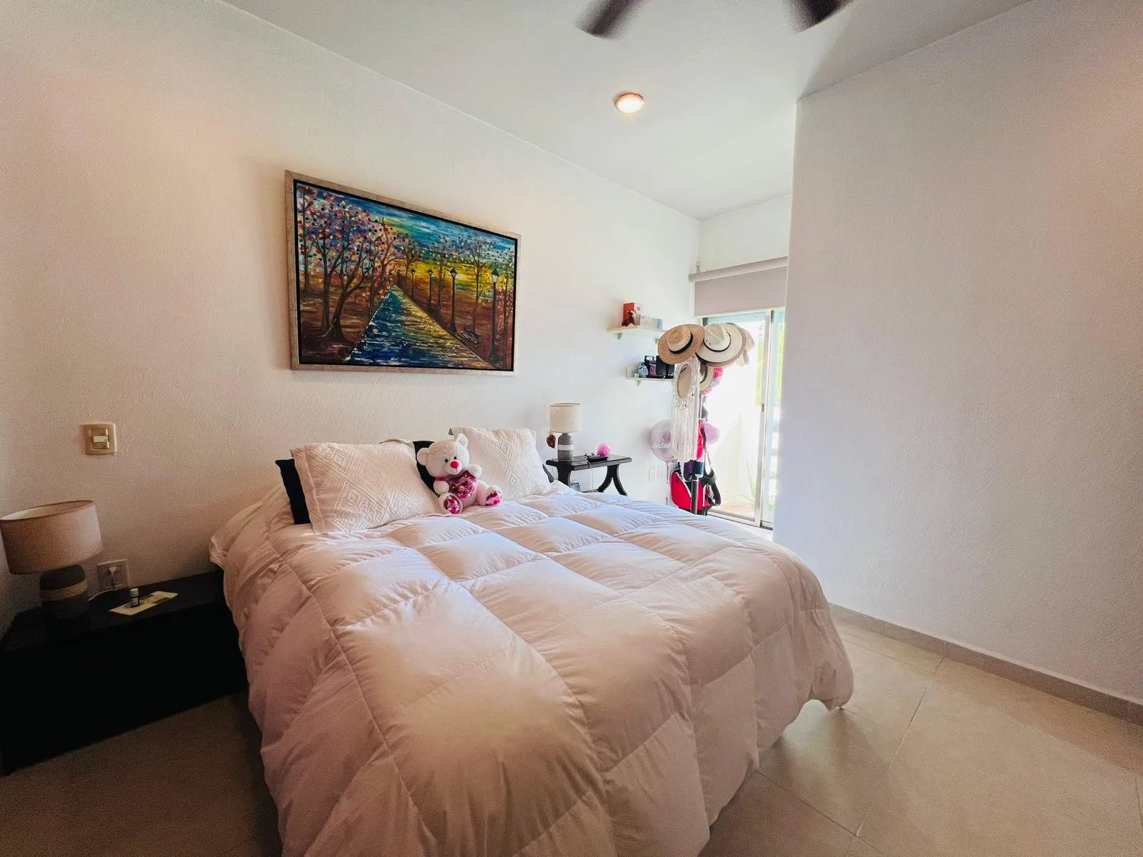 This apartment is located in the Residencial Mediterranee within Supermanzana 17. The layout includes a primary bedroom with an ensuite bathroom featuring a bathtub, and two secondary bedrooms. The bedrooms feature balconies with exterior views.