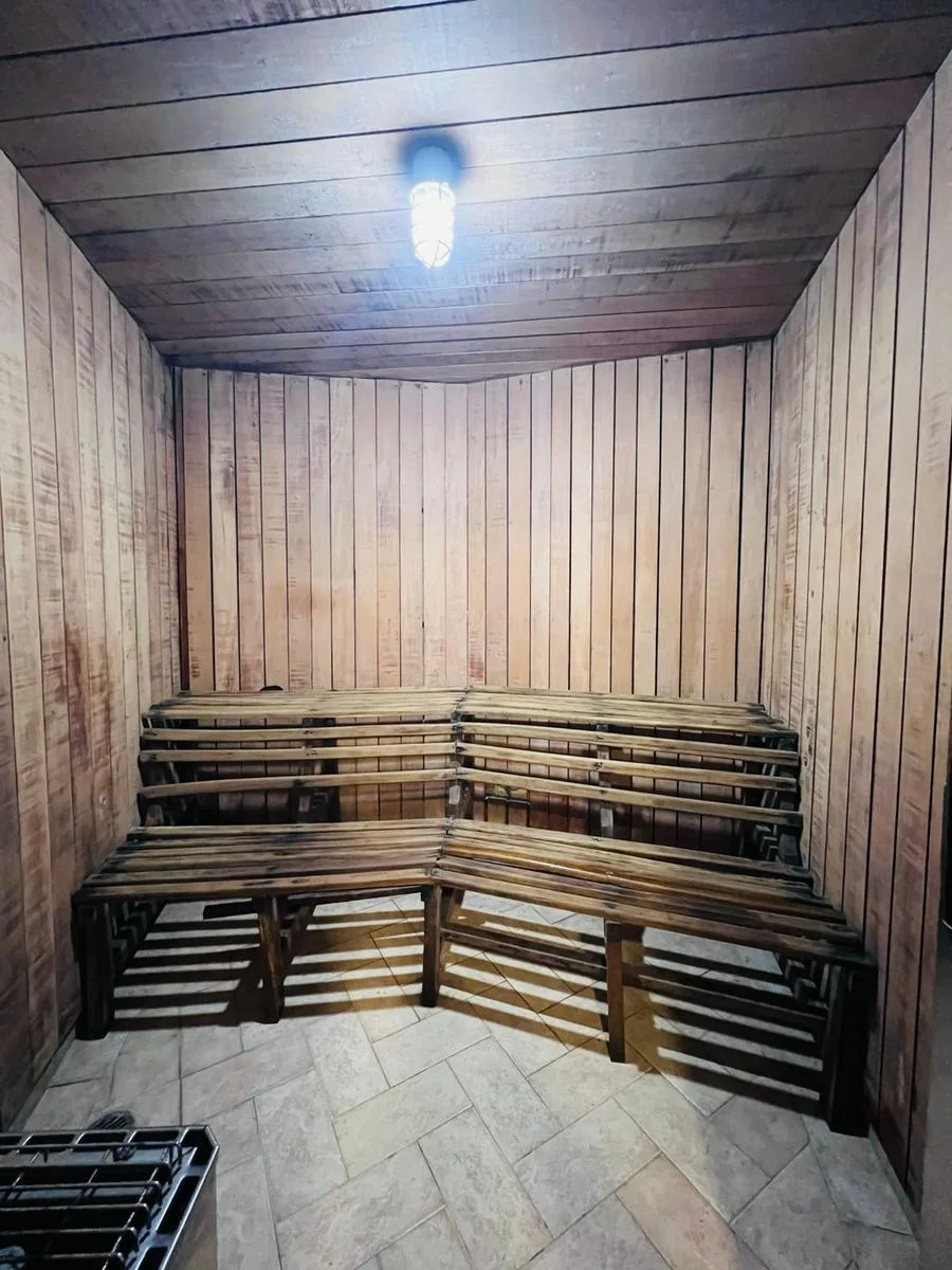 Private parking includes two covered spaces. Building amenities for residents consist of a communal swimming pool and a security gate.