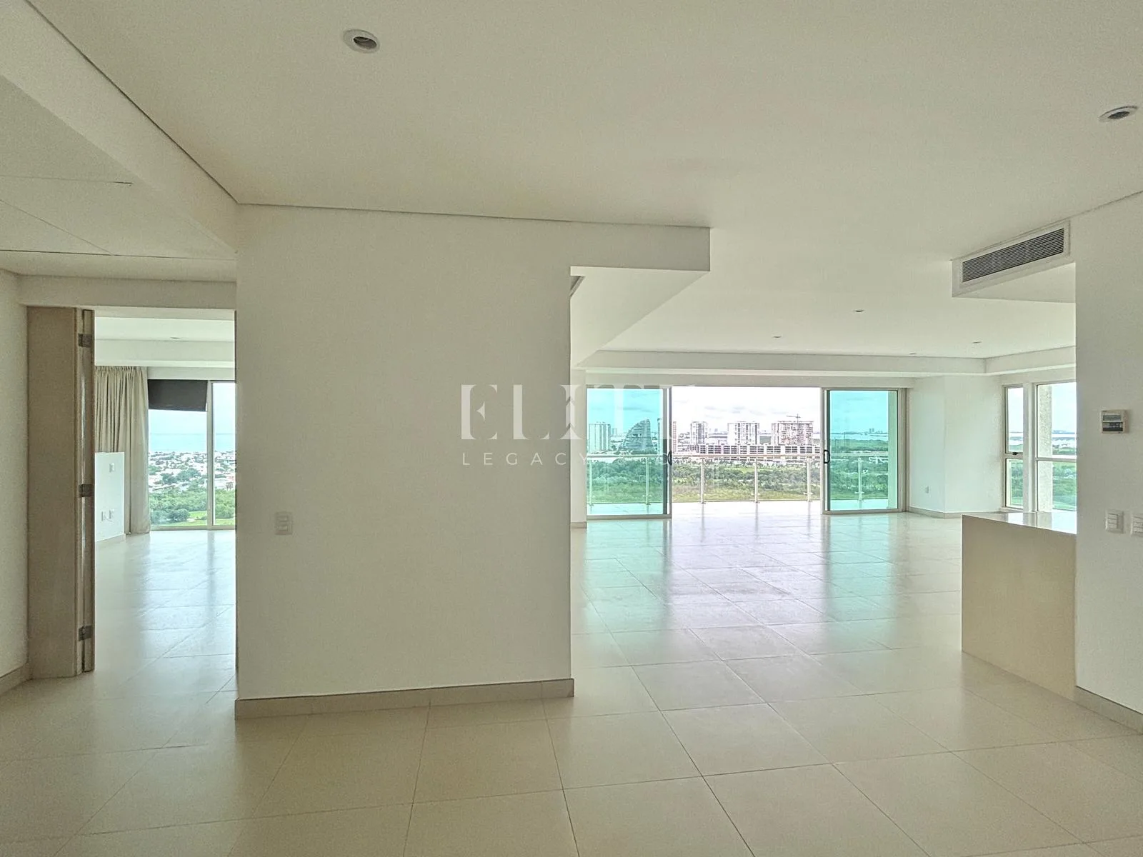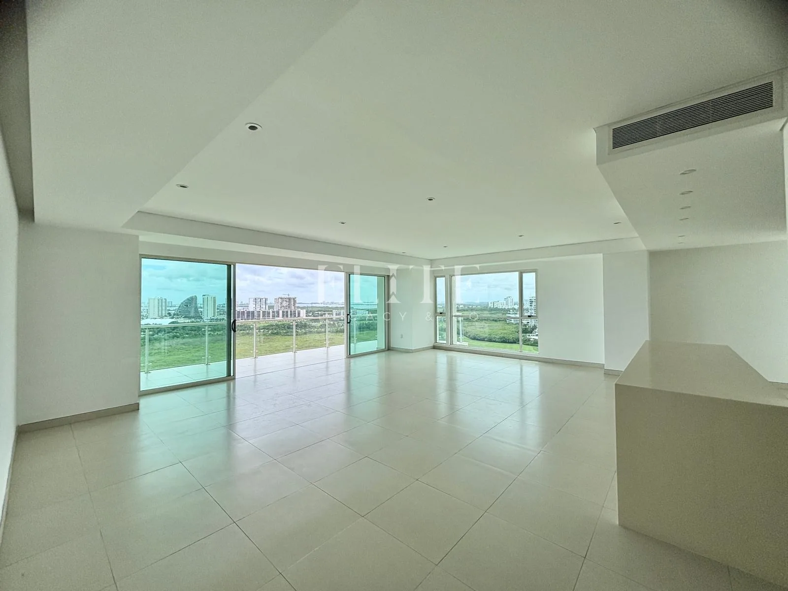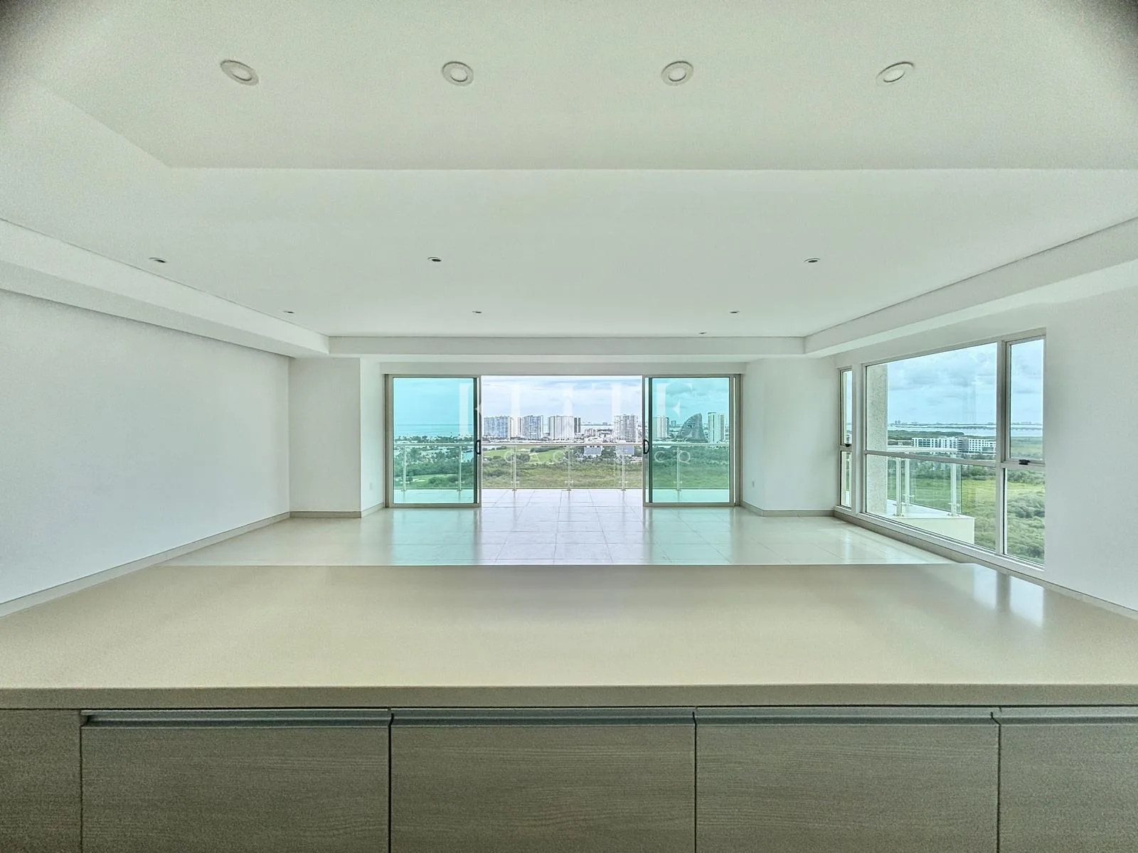The apartment offers direct access from the elevators into a combined living and dining area. The integrated kitchen includes a breakfast bar and a pantry. A half bathroom is available for guests. A terrace presents views of the golf course, Puerto Cancún, and the Caribbean Sea. The master bedroom is equipped with a walk-in closet and a full bathroom. Two secondary bedrooms each include closets and full bathrooms. Additional space can be used as a TV room or office.