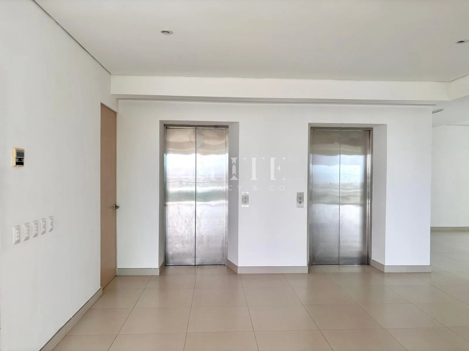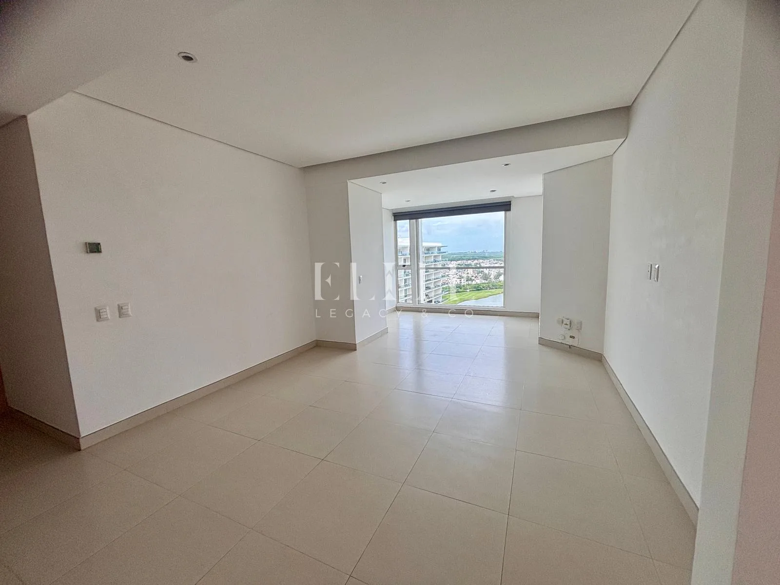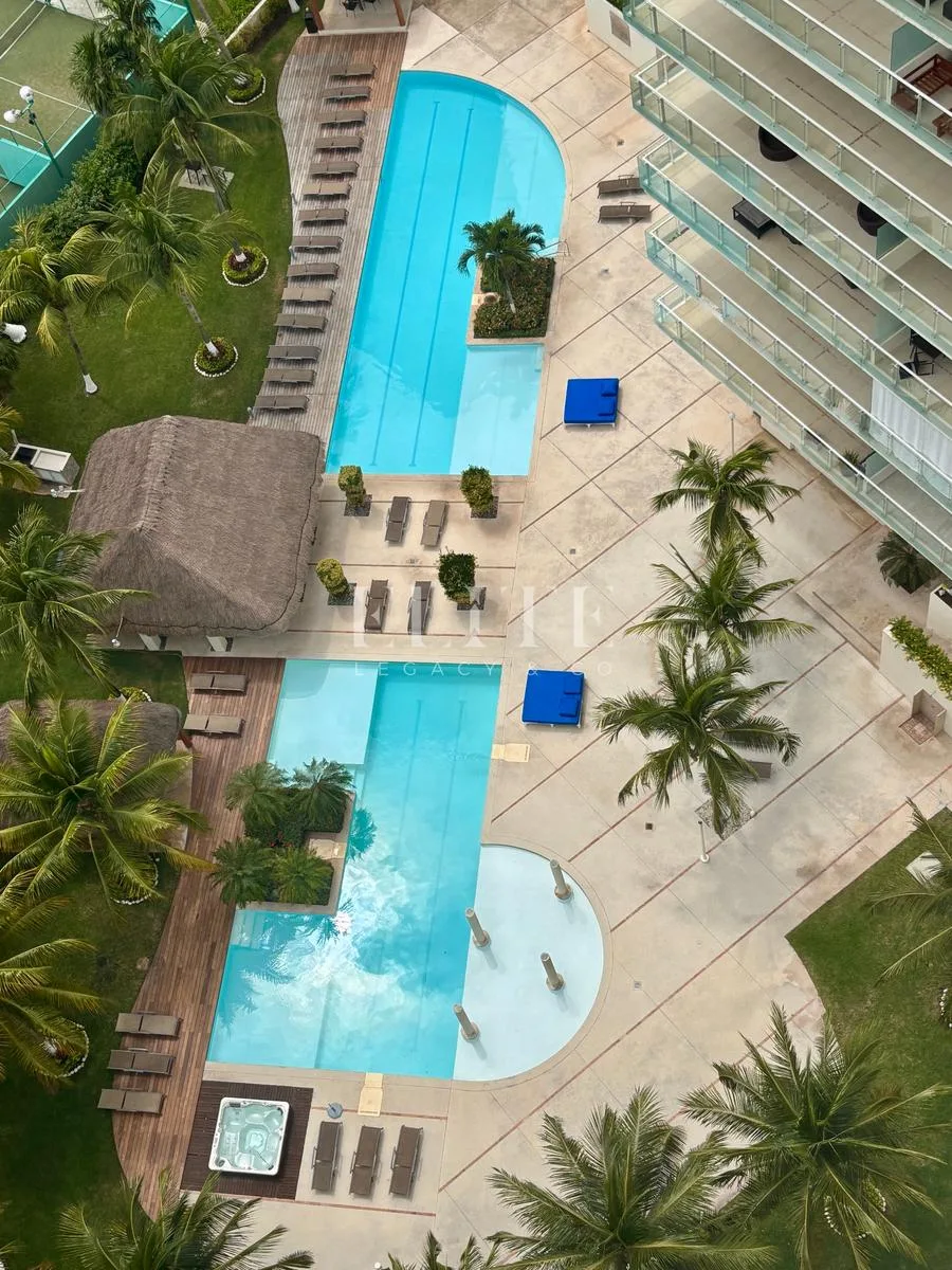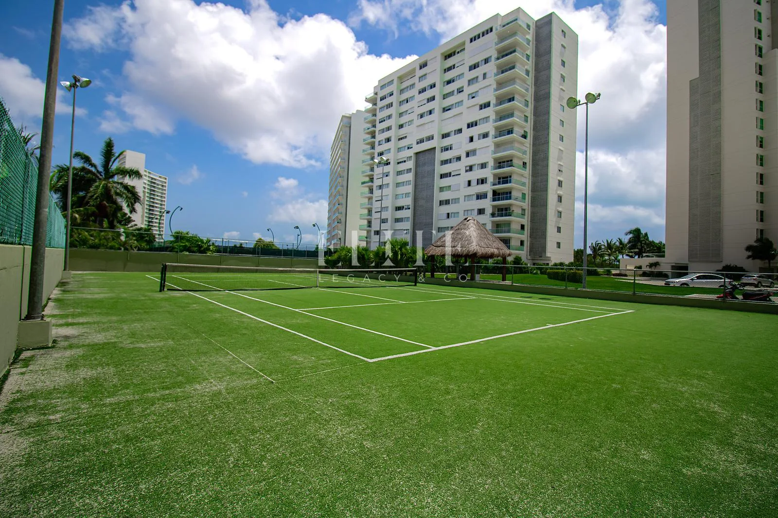 The apartment offers direct access from the elevators into a combined living and dining area. The integrated kitchen includes a breakfast bar and a pantry. A half bathroom is available for guests. A terrace presents views of the golf course, Puerto Cancún, and the Caribbean Sea. The master bedroom is equipped with a walk-in closet and a full bathroom. Two secondary bedrooms each include closets and full bathrooms. Additional space can be used as a TV room or office.