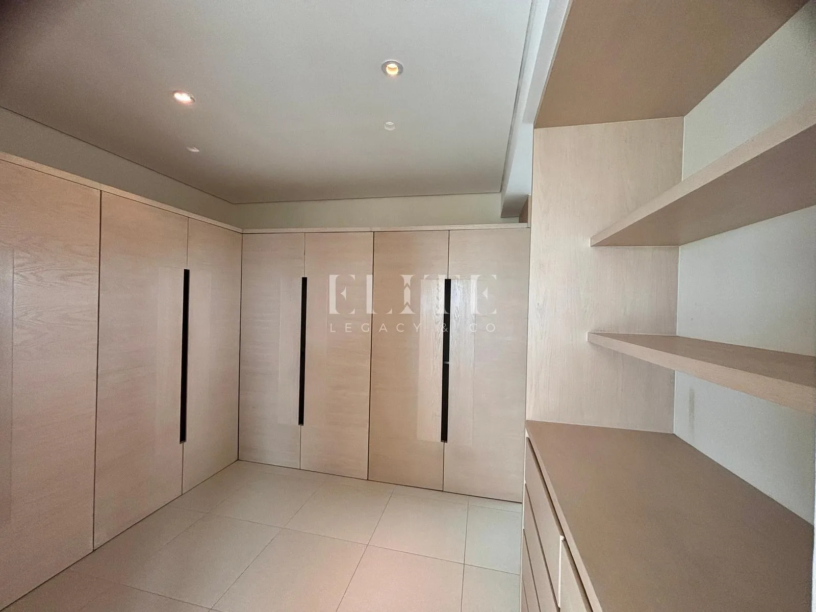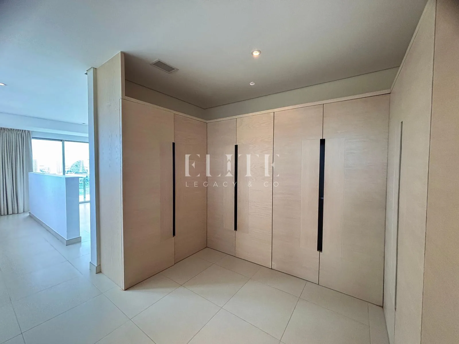 The unit also contains a linen closet, a laundry room, a spacious service room with a full bathroom, and a dedicated air conditioning equipment room. Service elevator access is provided. The property comes with two car spaces and one storage unit in the underground parking. It is fitted with curtains, blinds, and centralized air conditioning.