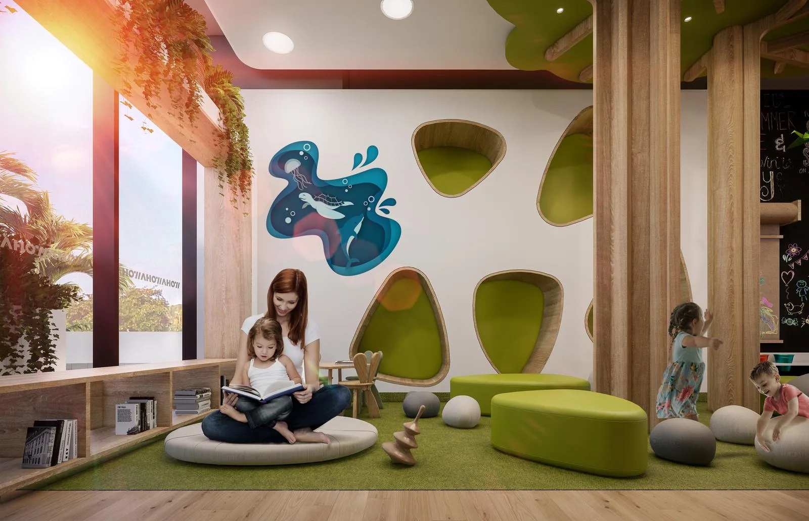The property includes a semi-Olympic swimming pool, children's pools, and an indoor and outdoor children's club. Additional amenities consist of a spa, a steam bath, a gym, a ballroom, a sports bar, and a grill area.