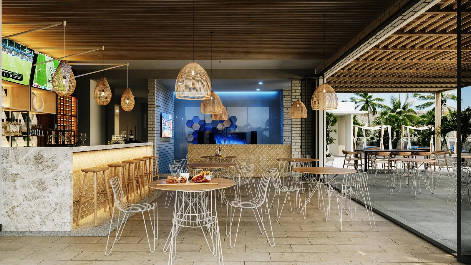 Additional facilities include a fitness gym, a coworking space, a game room, and a children's playroom. There is also a sports bar, a jacuzzi, a zen area, a panoramic viewpoint, an outdoor fire pit, and a sky bar. The property includes sunbathing decks with Bali beds.