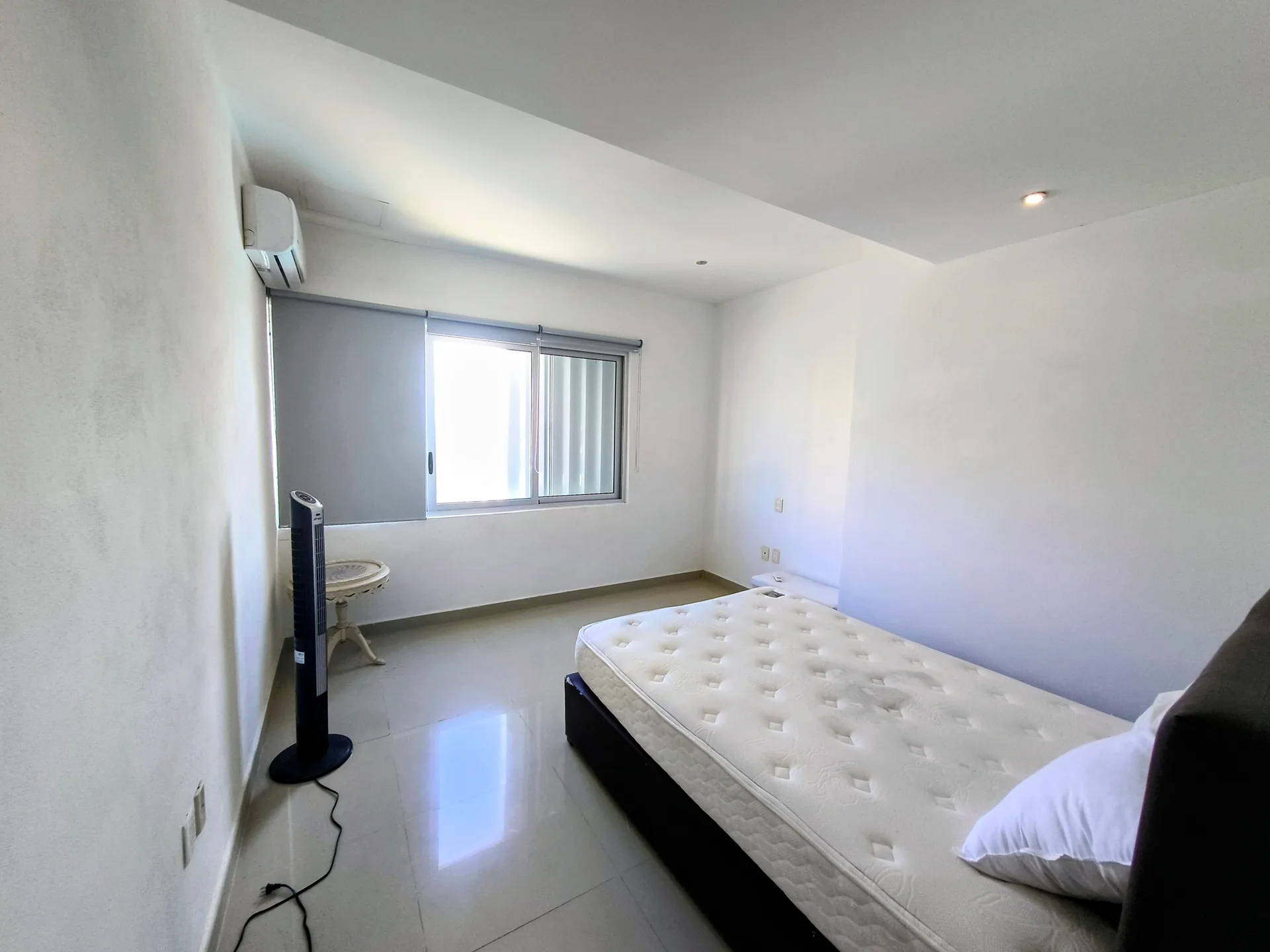 There are two bedrooms. The master bedroom has an ensuite bathroom and a walk-in closet. The secondary bedroom includes a full bathroom. Mini-split air conditioning units are installed in each room. The property includes two assigned covered parking spaces.