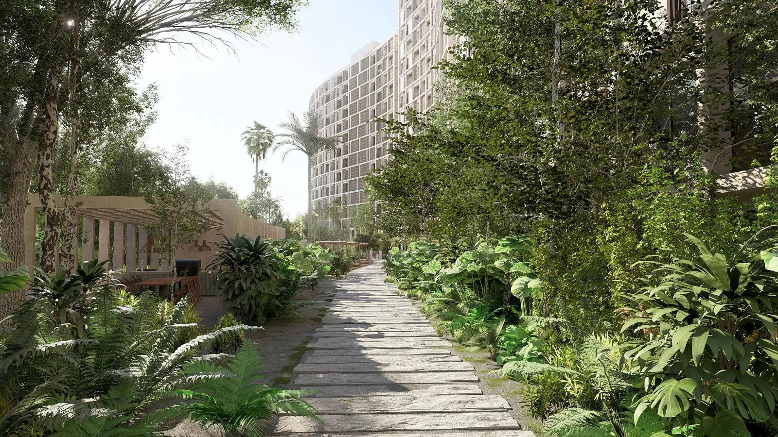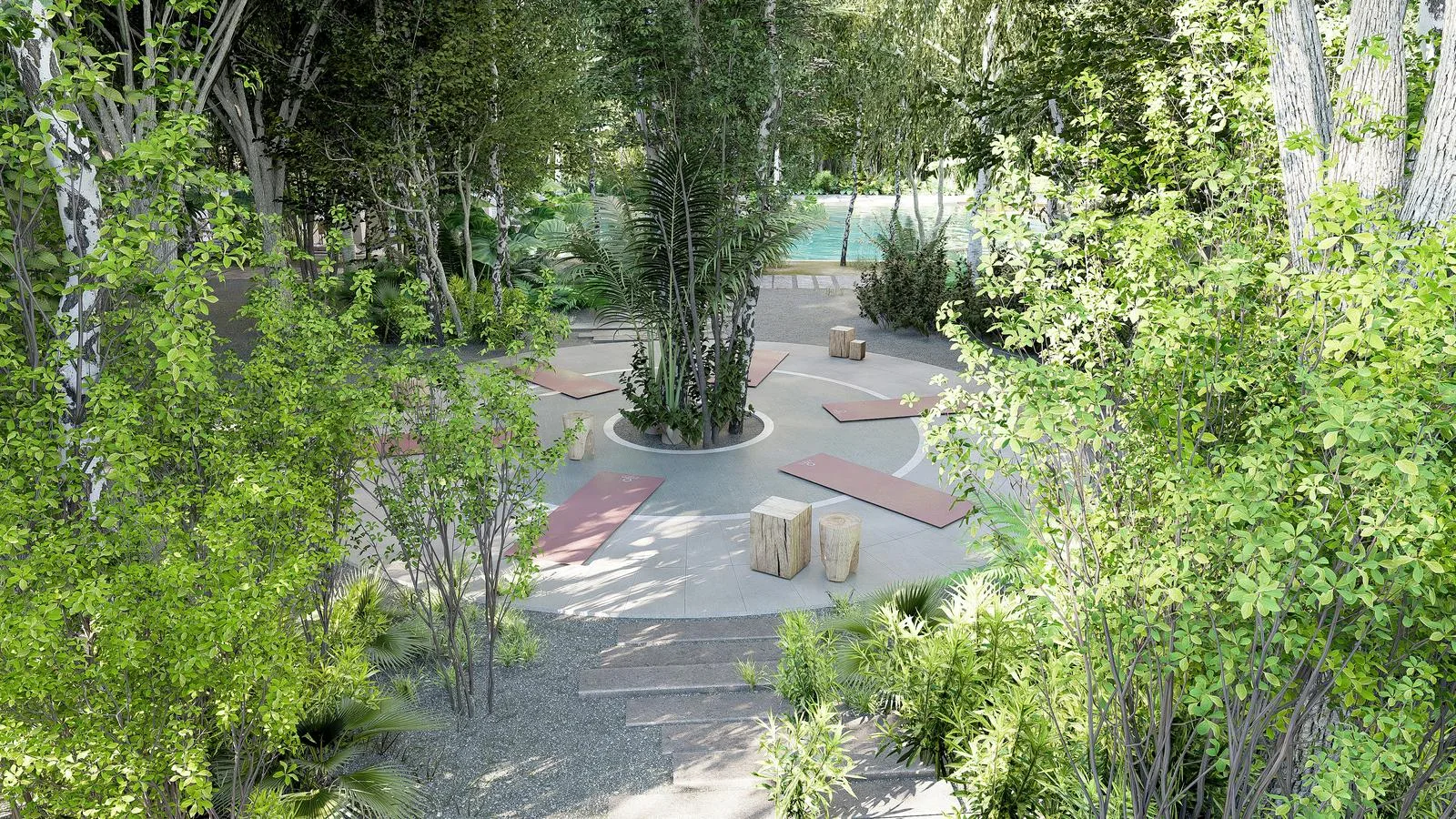 The residential complex features over 17, 000 square meters of green areas and amenities. These include a fitness club, yoga deck, swimming lane, spa, and natural trails. For work, there is a business hub and dedicated work spots. Leisure amenities consist of a sky lounge, pet park, family swimming pool, paddle tennis courts, and barbecue areas.