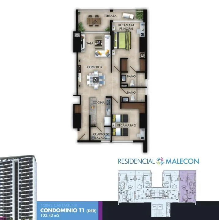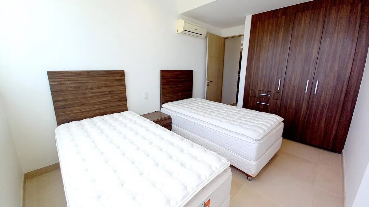 The apartments feature views of the sea and the lagoon. They are located in a tower within the Malecón Américas residential and commercial complex.