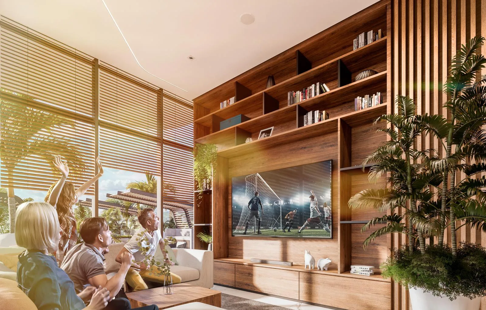 The development includes a semi-olympic pool and separate children's pools. A kids club is available with both outdoor and indoor areas. Additional amenities consist of a spa, steam room, gym, dance hall, sport bar, and grill.