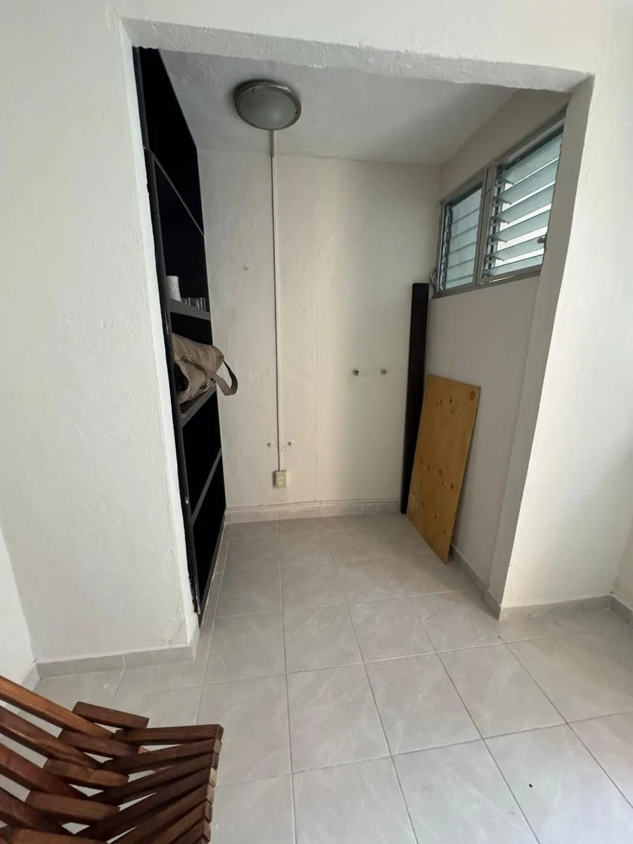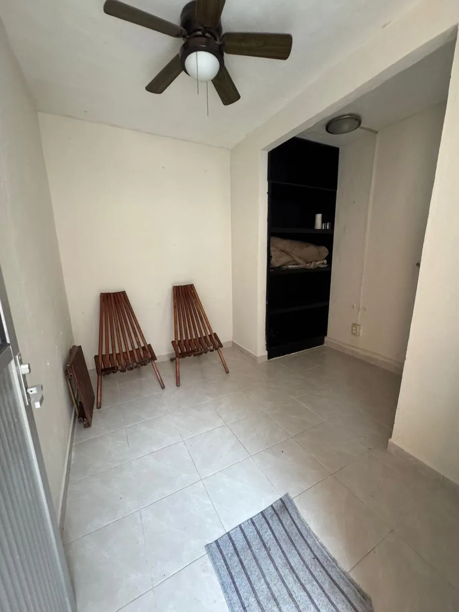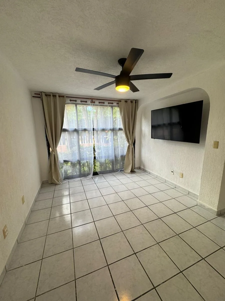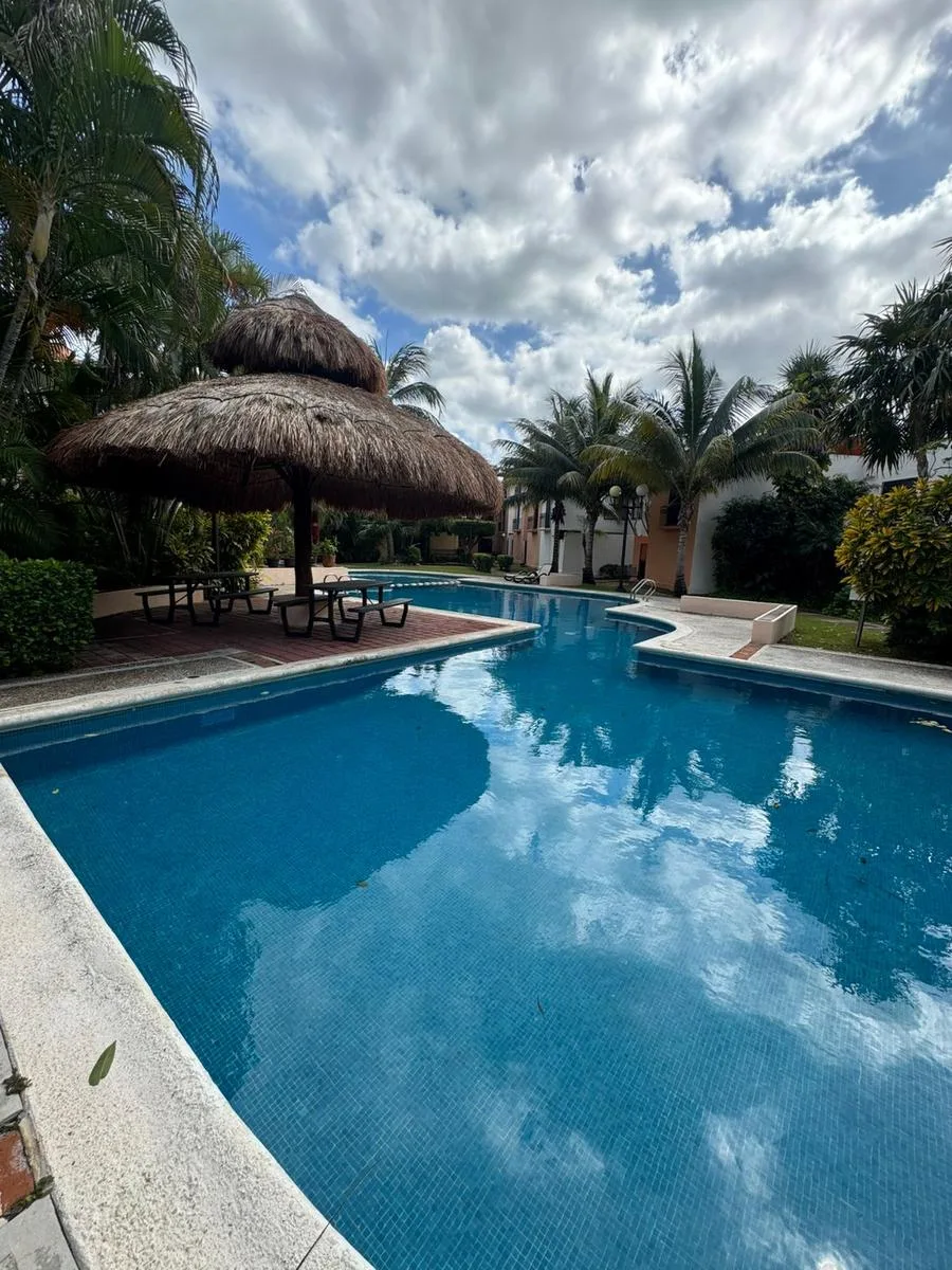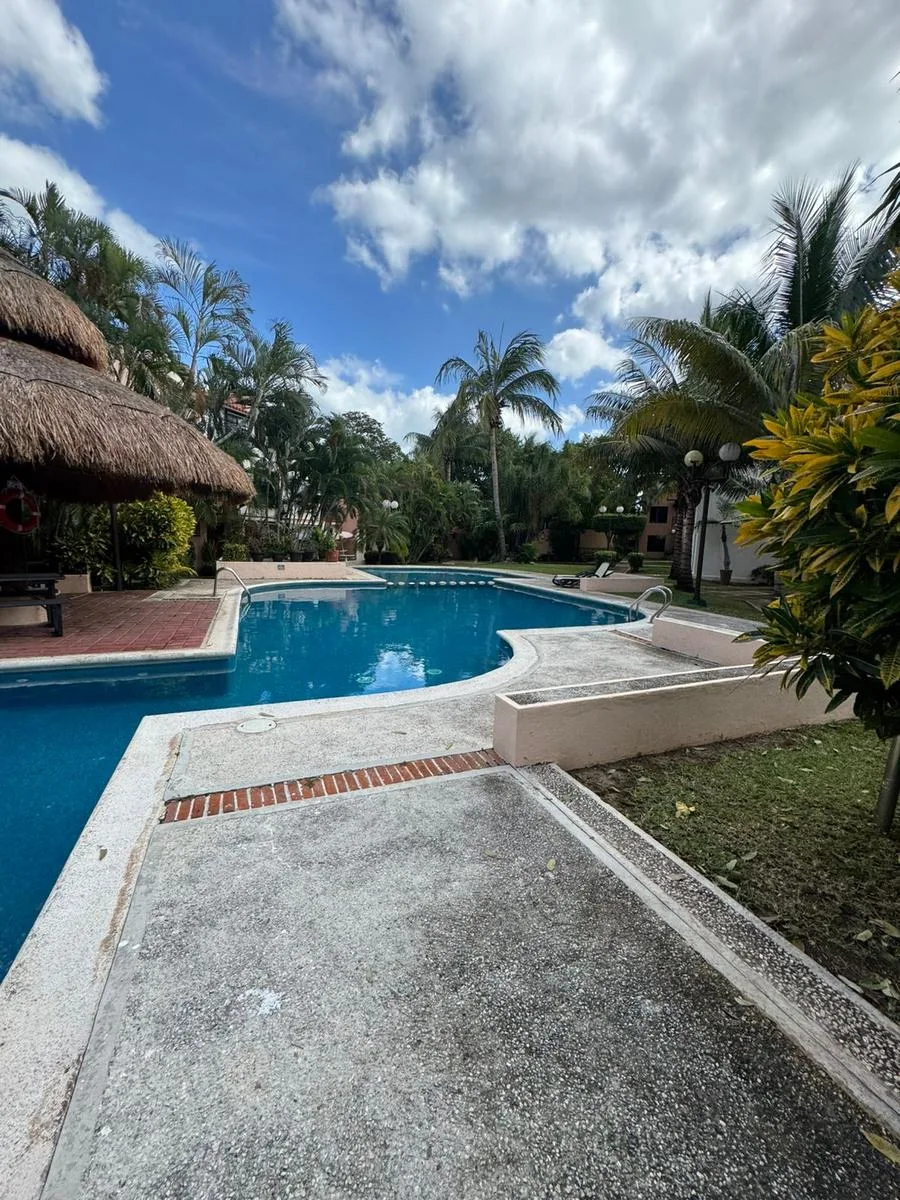 Residential amenities offer covered parking for two cars, a 24/7 security booth, a communal pool, a palapa, and sunbeds. The property is situated in the central SM 18 area.