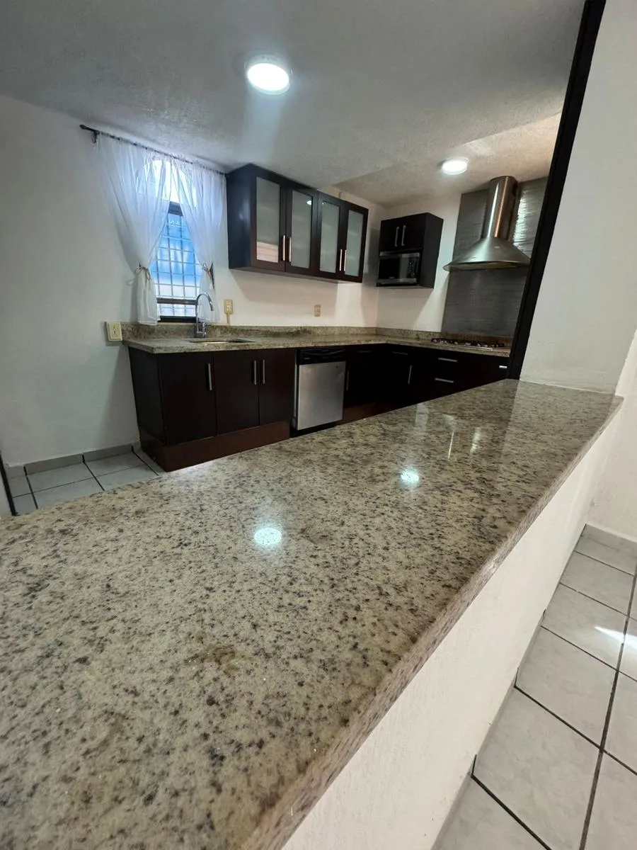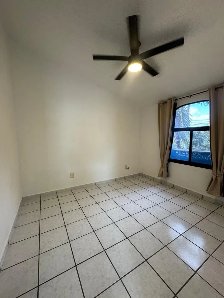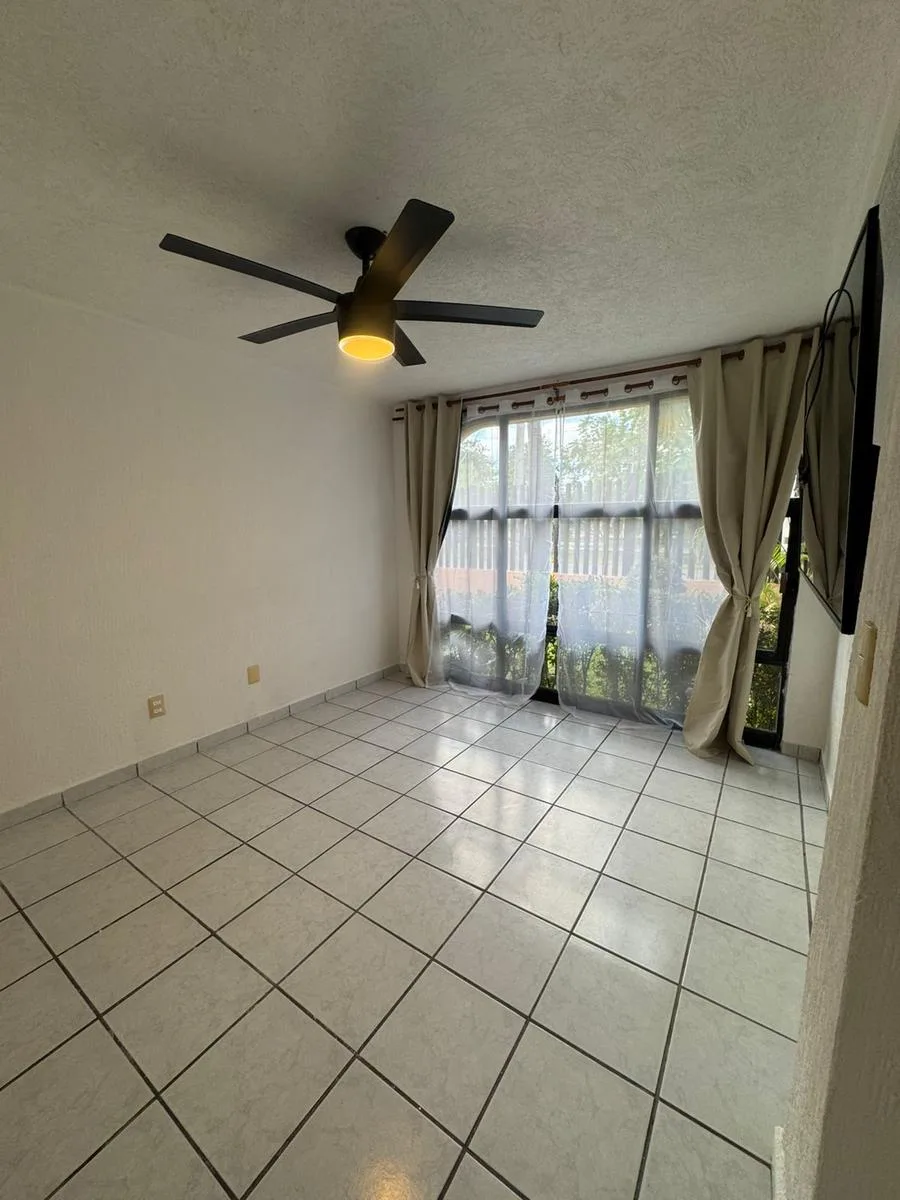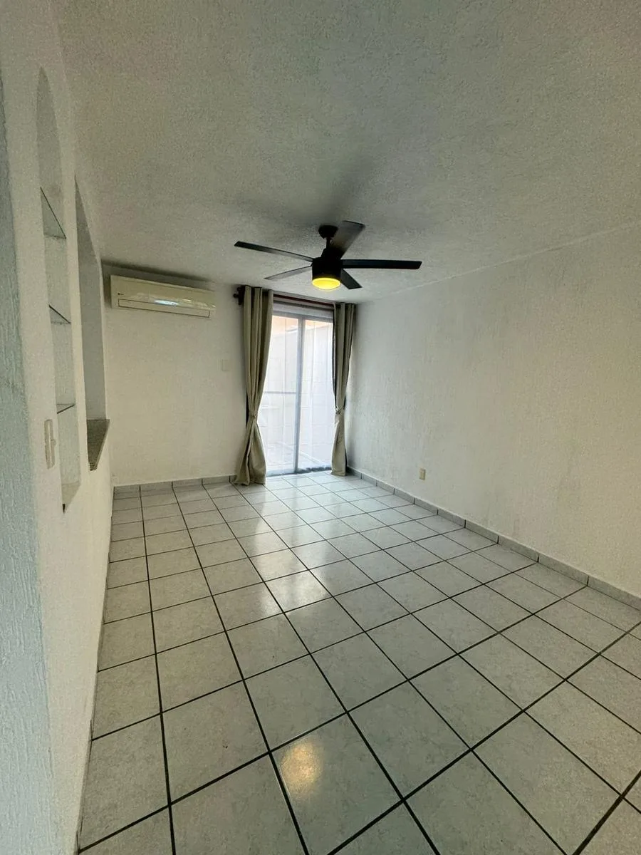 Residential amenities offer covered parking for two cars, a 24/7 security booth, a communal pool, a palapa, and sunbeds. The property is situated in the central SM 18 area.