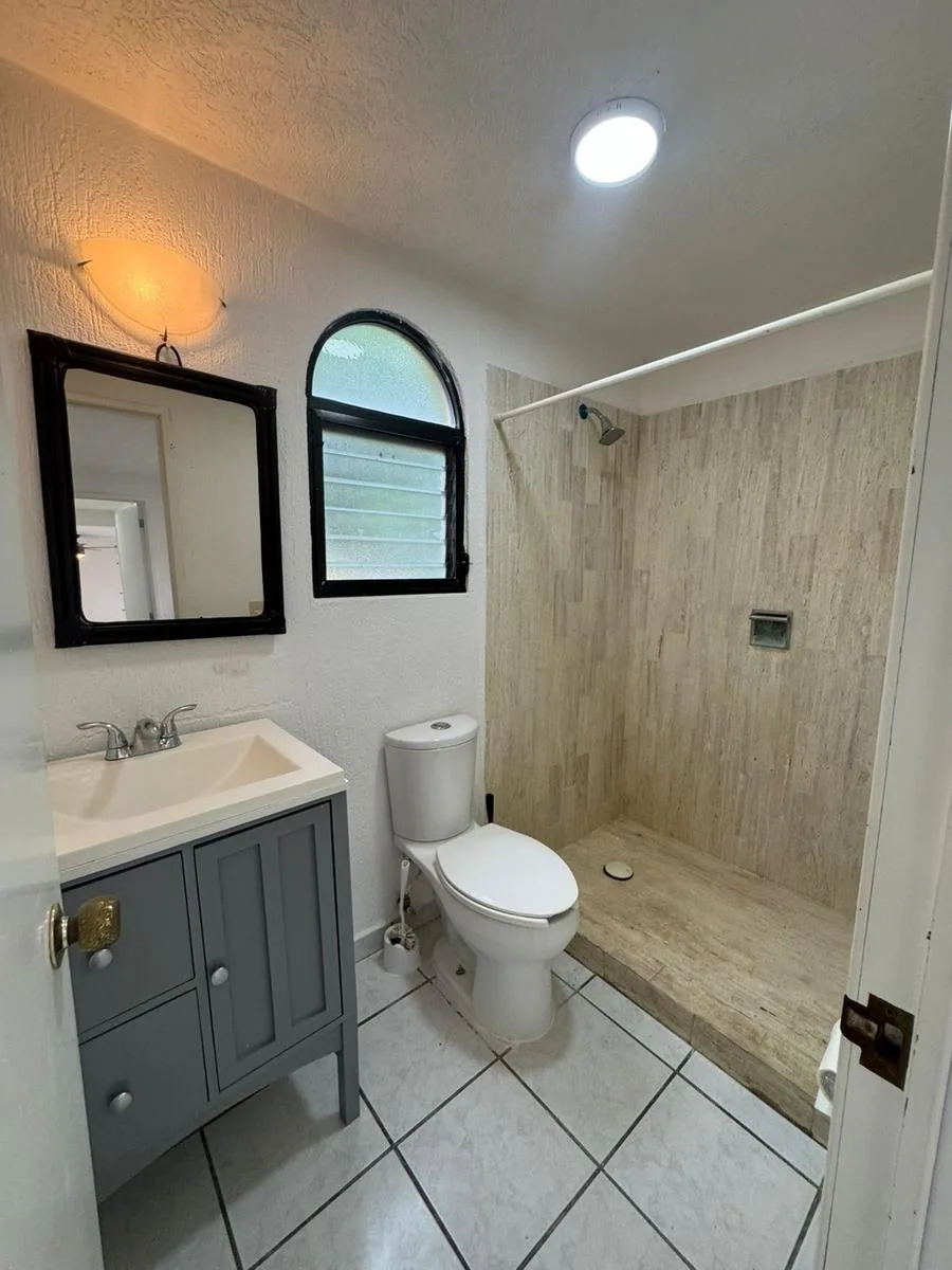 The upper floor includes three bedrooms. The master bedroom has a full bathroom, and all bedrooms are equipped with closets, air conditioning, and fans with control. There are two full bathrooms on this level.