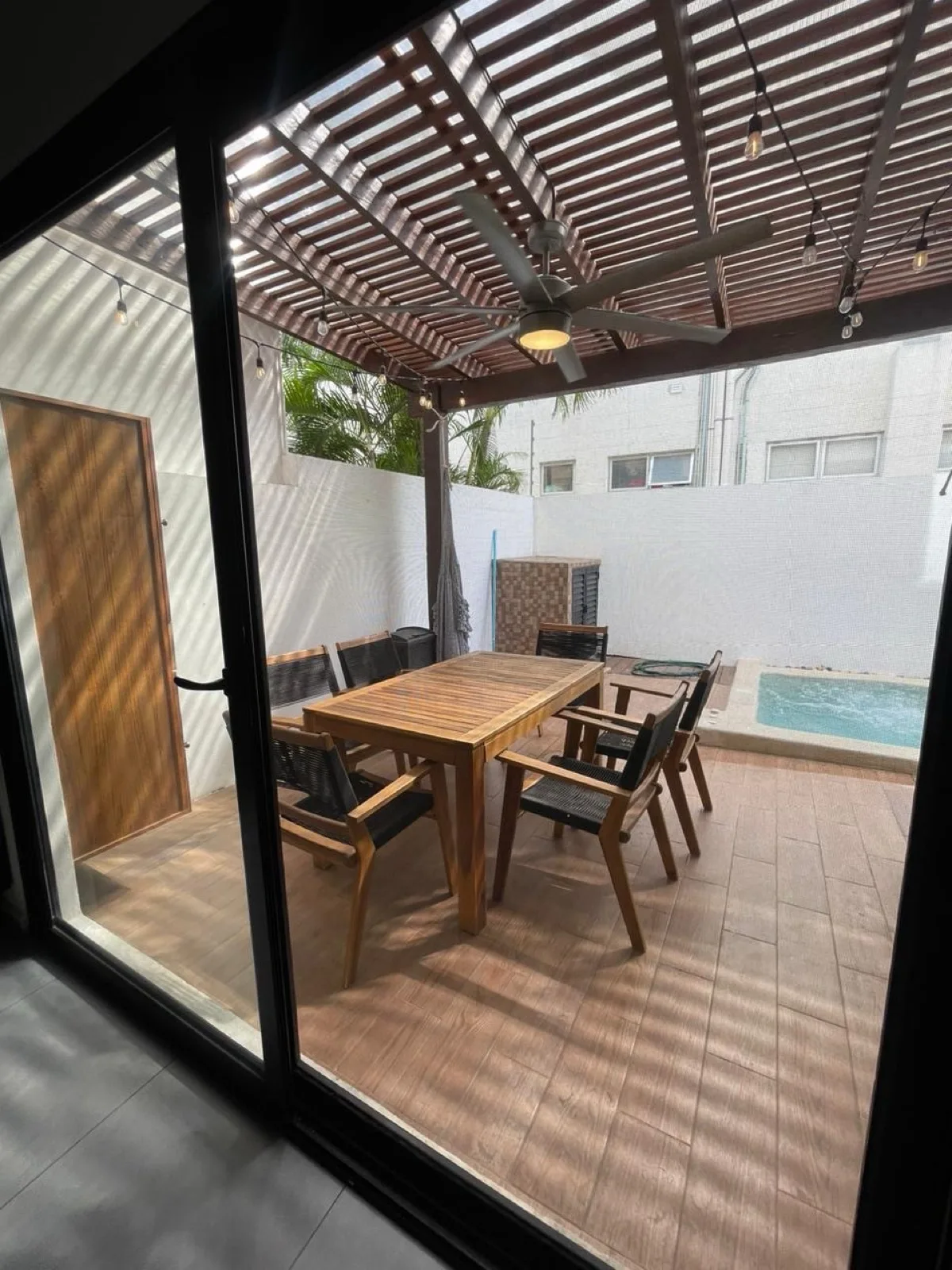 The layout includes a living room, a dining room, and a fully equipped kitchen. A private terrace and a swimming pool are accessible from the home.