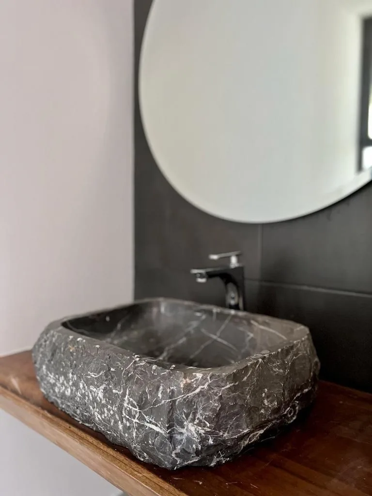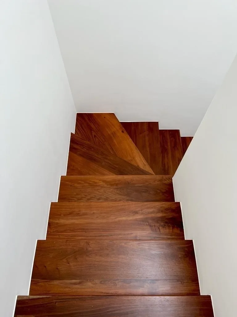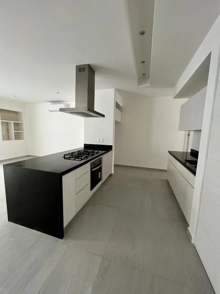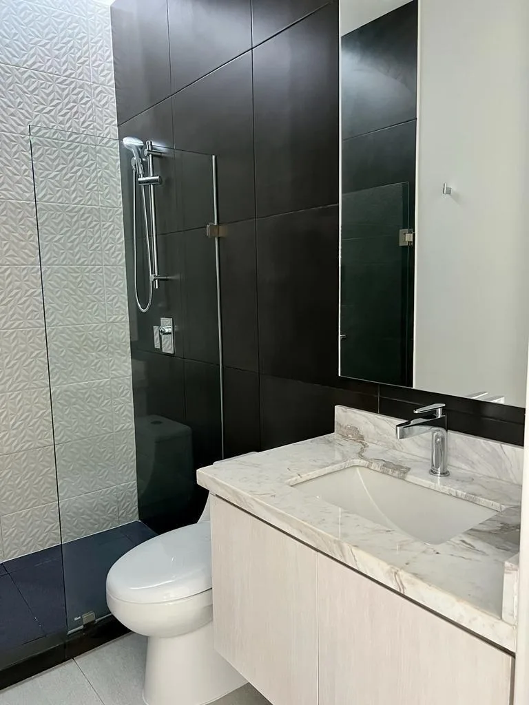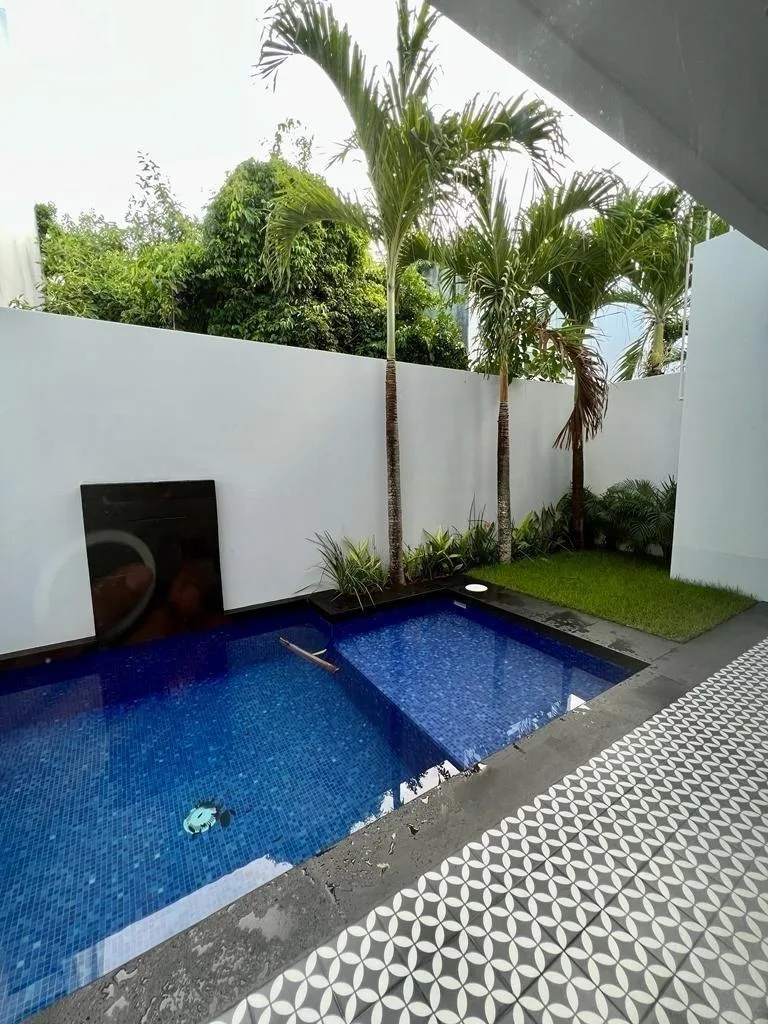 The first level features an integrated kitchen, a spacious living and dining area, a guest bathroom, and a private swimming pool. This level also includes a room with a full bathroom.