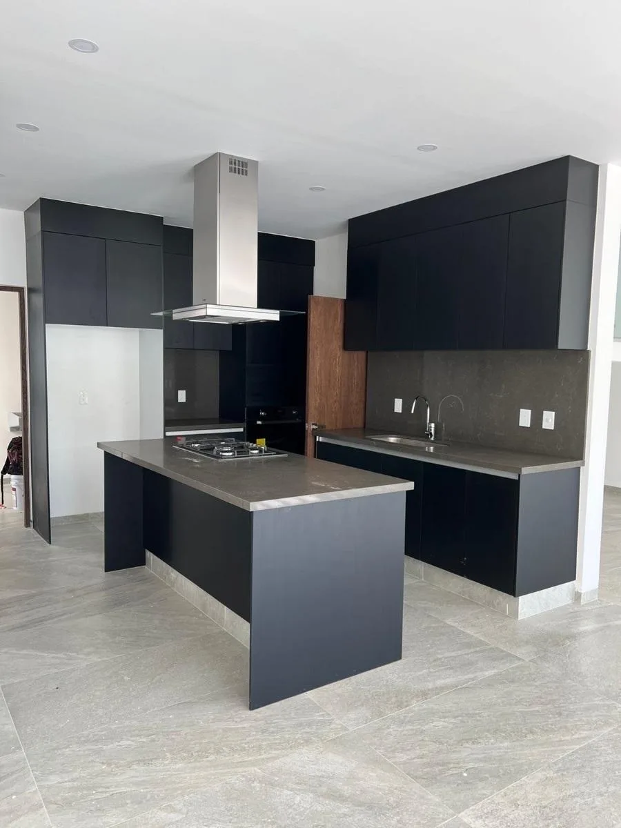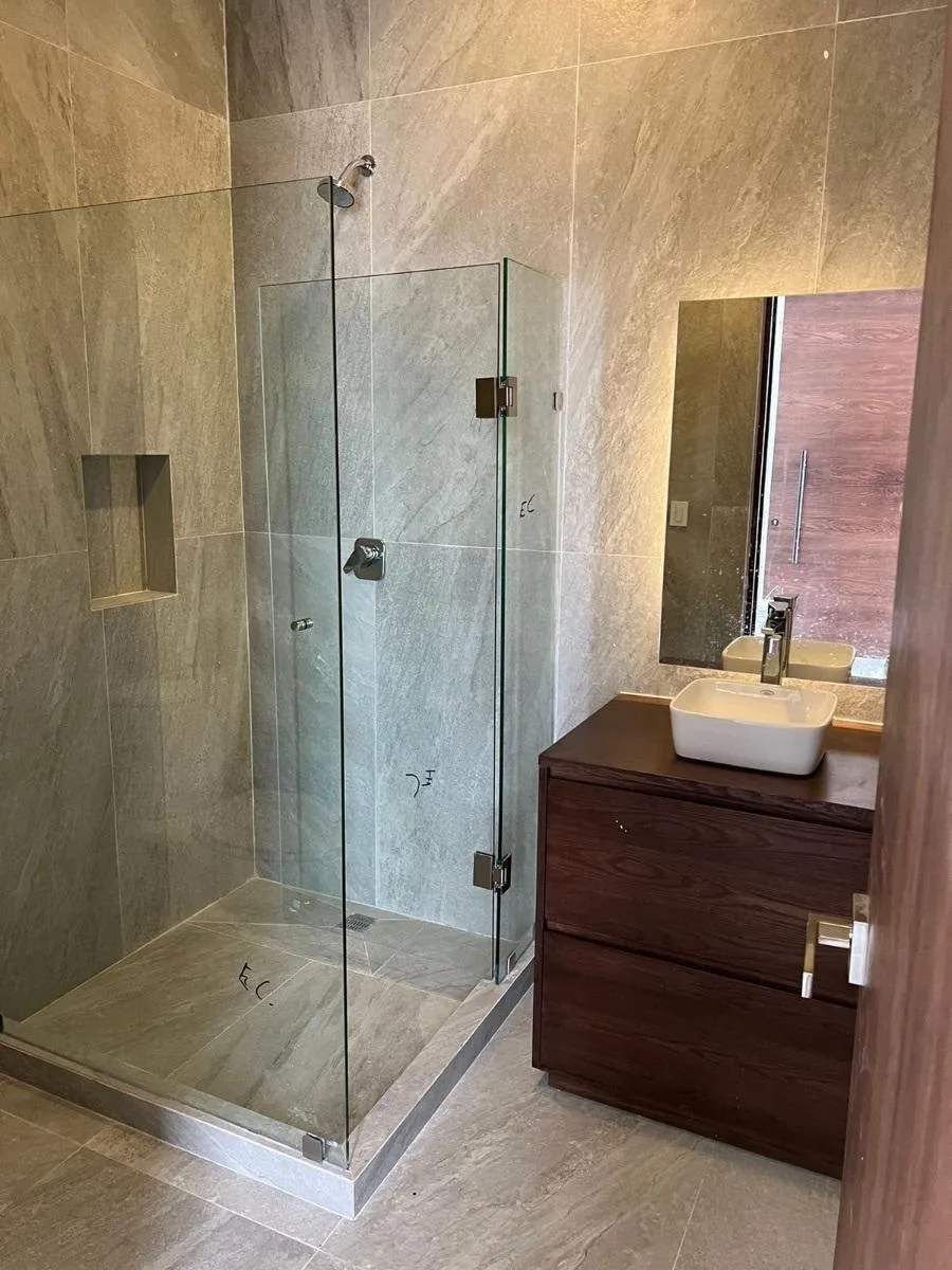 The residence features three bedrooms, each with its own private bathroom. The layout includes a living room, a dining area, and a kitchen. A separate TV room and a dedicated bar area are also provided.