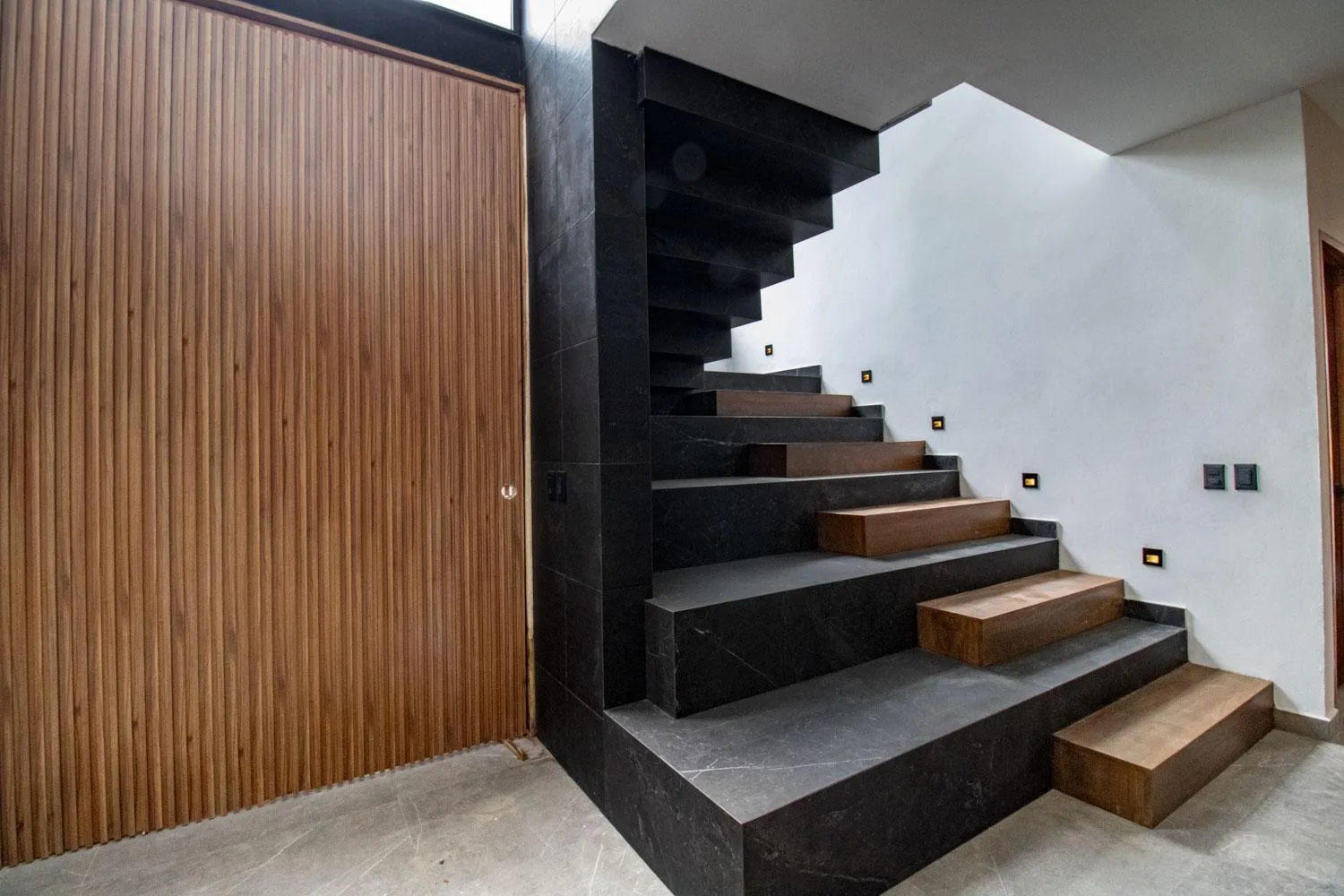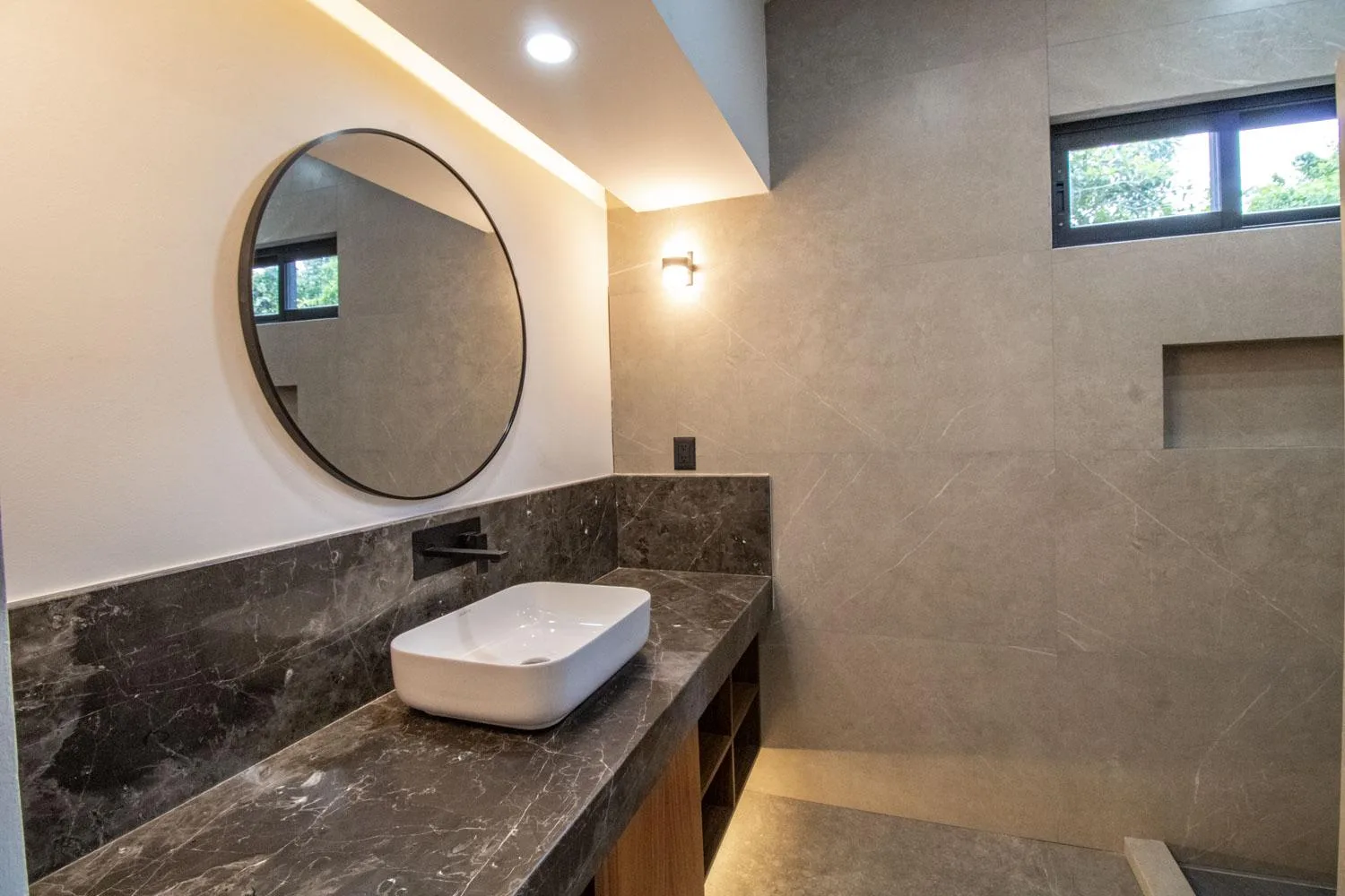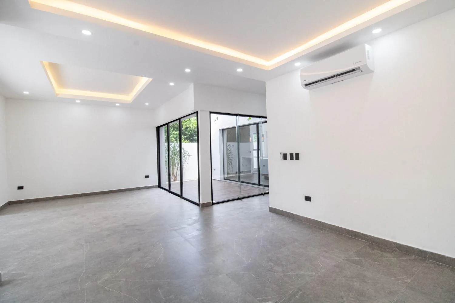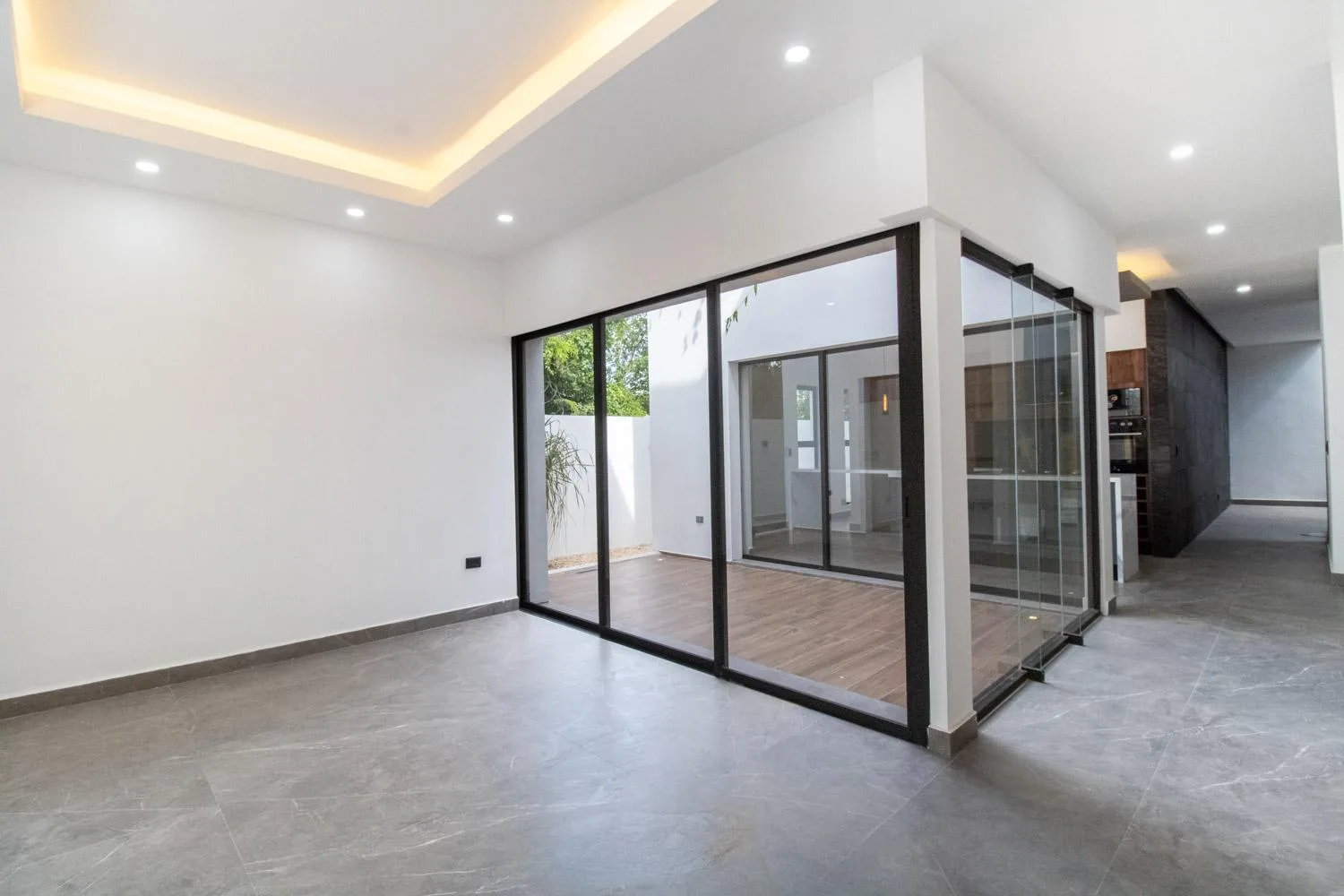The first level of the residence comprises a living and dining room, an interior garden with glass and natural light, a fully equipped kitchen, and a pantry with ample cooking space. There is a family room with a full bathroom that can be used as a fourth bedroom, a half bathroom for guests, a pool with a social terrace and an exterior half bathroom, a basement suitable for storage or a game area, a laundry room, a service room with independent access, and covered parking for two vehicles.