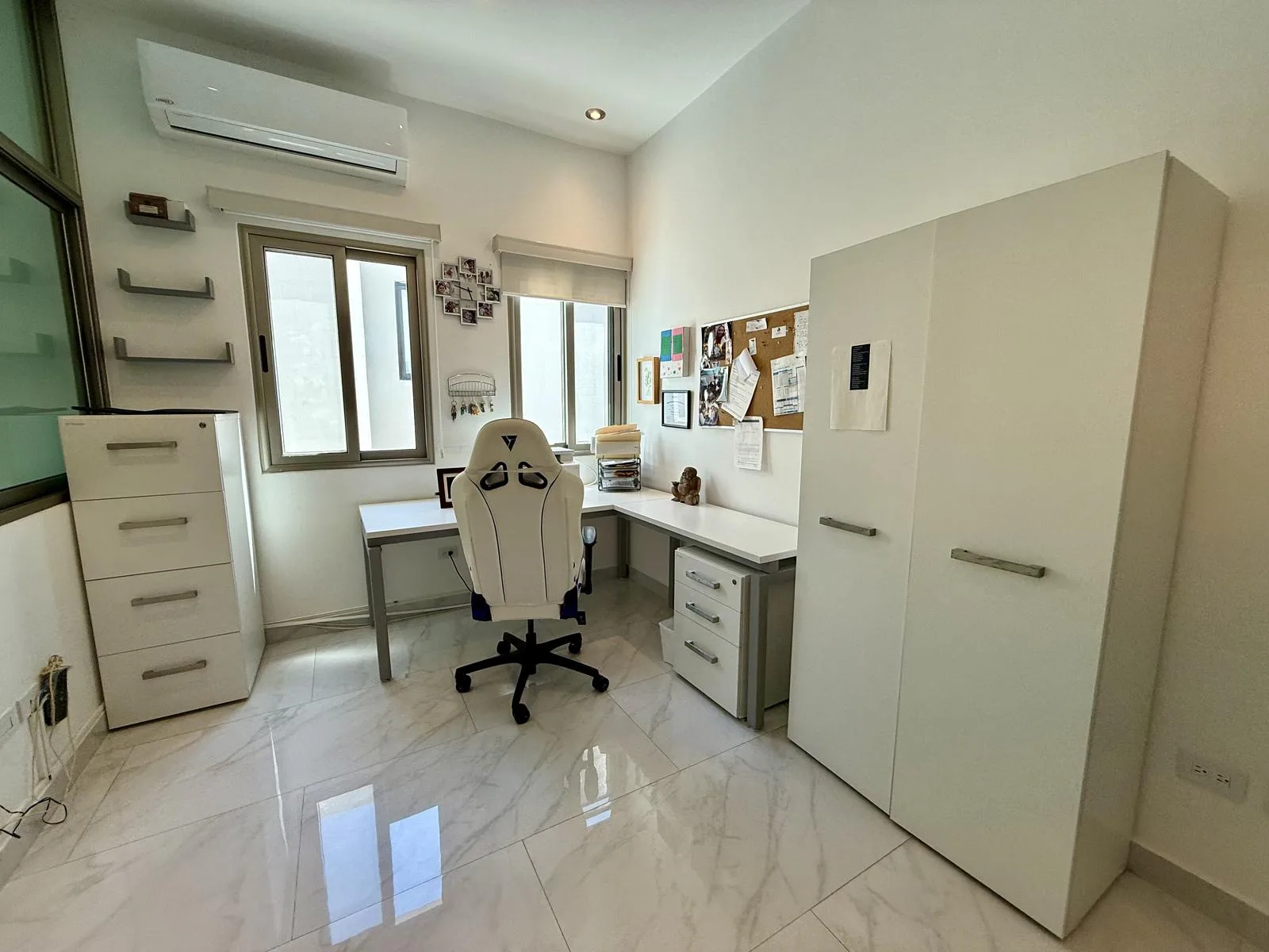 The first floor features three bedrooms, each with a full bathroom, a study that can be used as an office, a laundry area with a refrigerator, and one additional bedroom.