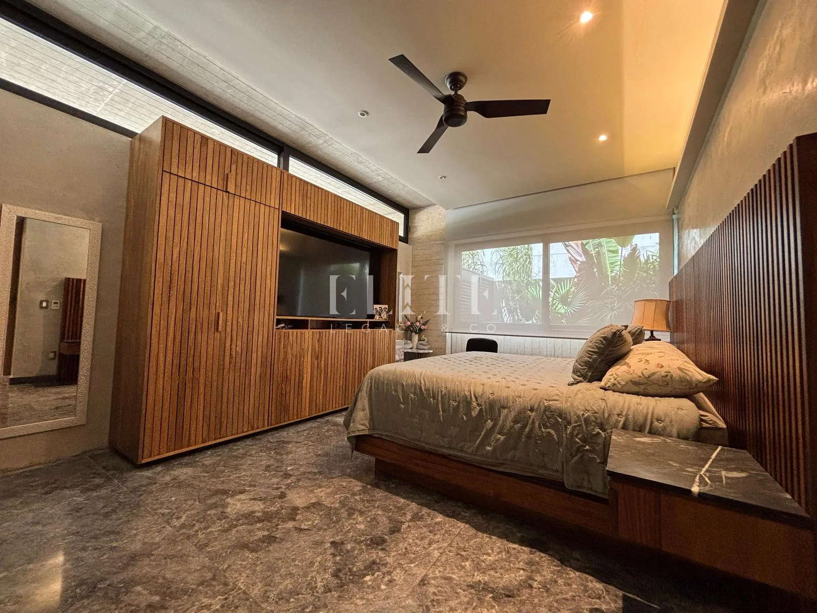 The second level comprises the primary bedroom with a spacious walk-in closet and full bathroom. Three secondary bedrooms each feature a full bathroom and closet. This level also includes an equipped cinema with projector and sound system, and a laundry and ironing area.