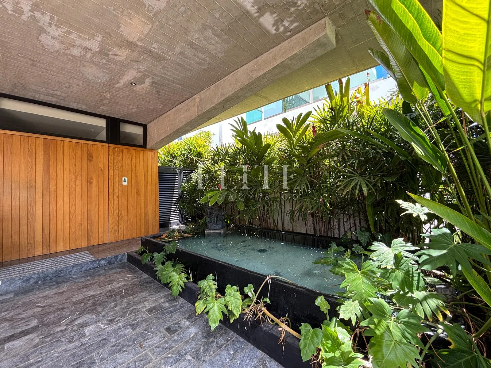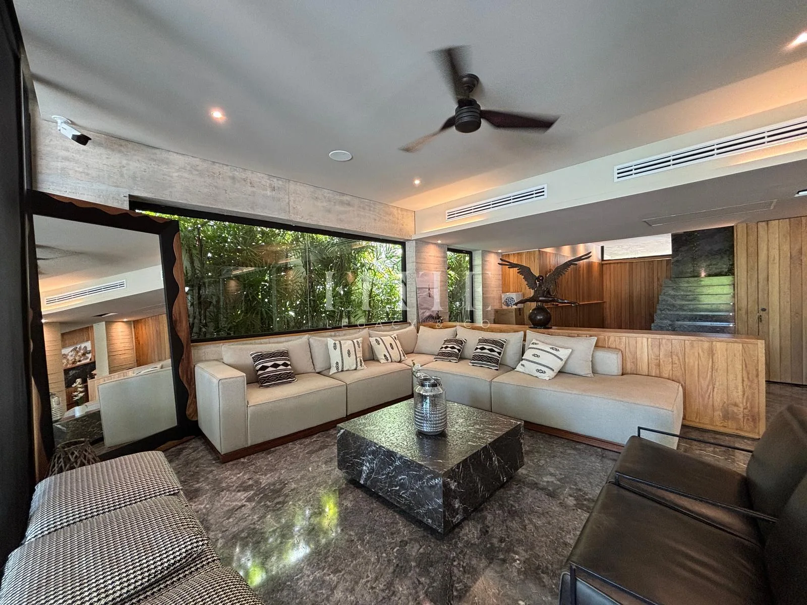 The house includes four bedrooms, a private cinema and bar, a fully equipped gym, and an infinity pool surrounded by green areas. It is furnished with custom-designed pieces.