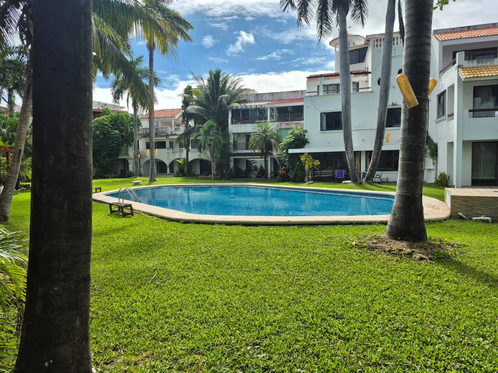 This house is situated on a corner lot within a condominium in the Hotel Zone (Pok Ta Pok). It offers views of the golf course and provides access to a common area with a swimming pool.