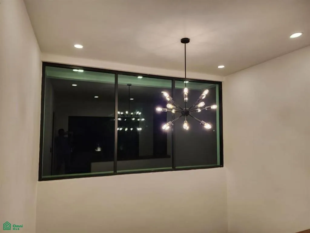 The home features four bedrooms. The living and dining room includes large windows. The kitchen is fully equipped and features high-quality finishes. The property includes a private garden and pool, along with a three-car garage.