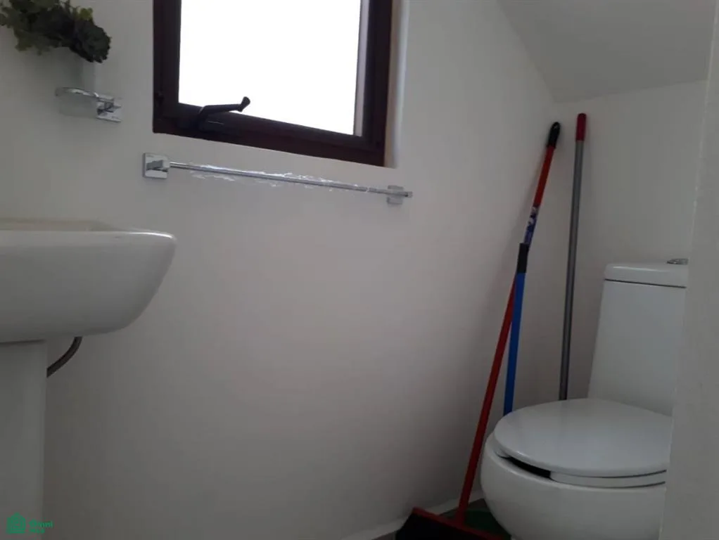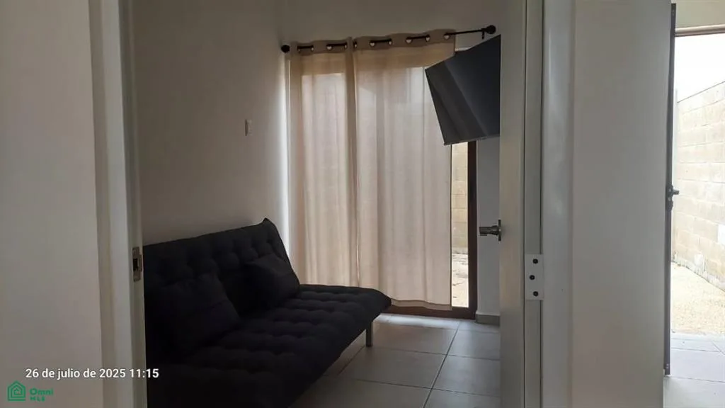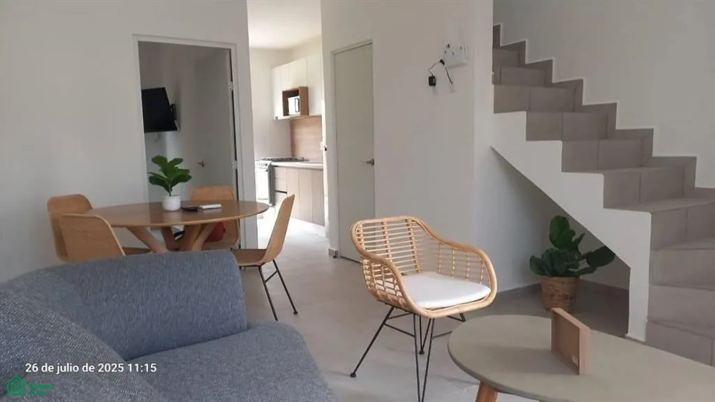The upper floor is dedicated to two bedrooms, each with closets and curtains. A full bathroom serves this level. The home is fully furnished and comes with air conditioning, pedestal fans, and integrated LED lighting throughout. The kitchen includes a stove, and the property is equipped with stationary gas and a boiler.