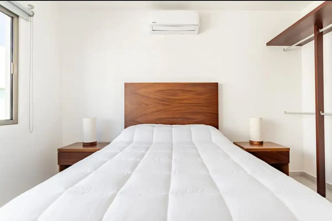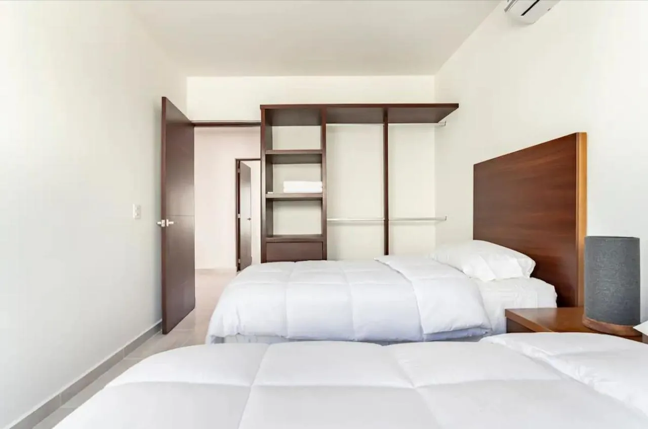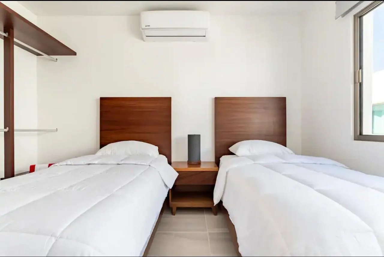 The three bedrooms each have minisplit air conditioning units, closets, and beds. The beds include king, queen, and single sizes.