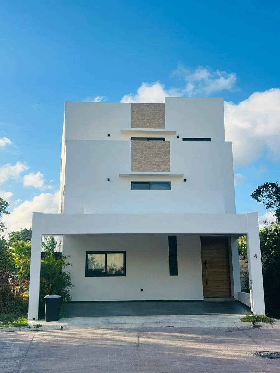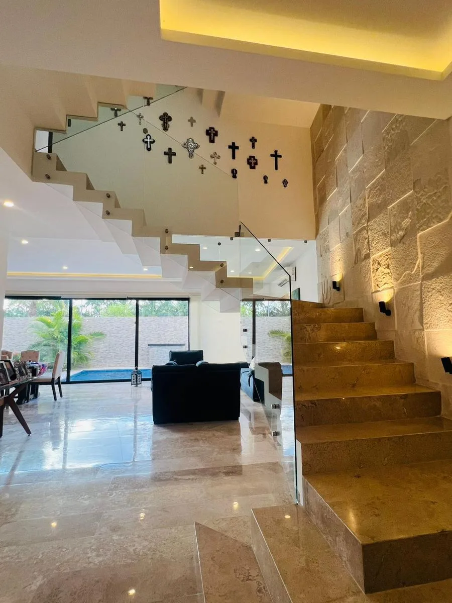 This house is located in the Residencial Rió community. The ground floor features an equipped kitchen with a granite breakfast bar, a living room, and a dining area. This level also includes one bedroom with a full bathroom, a service room, and a laundry area. It opens to an outdoor area with a swimming pool featuring a waterfall, a full bathroom, and a terrace. Parking is available for three cars.