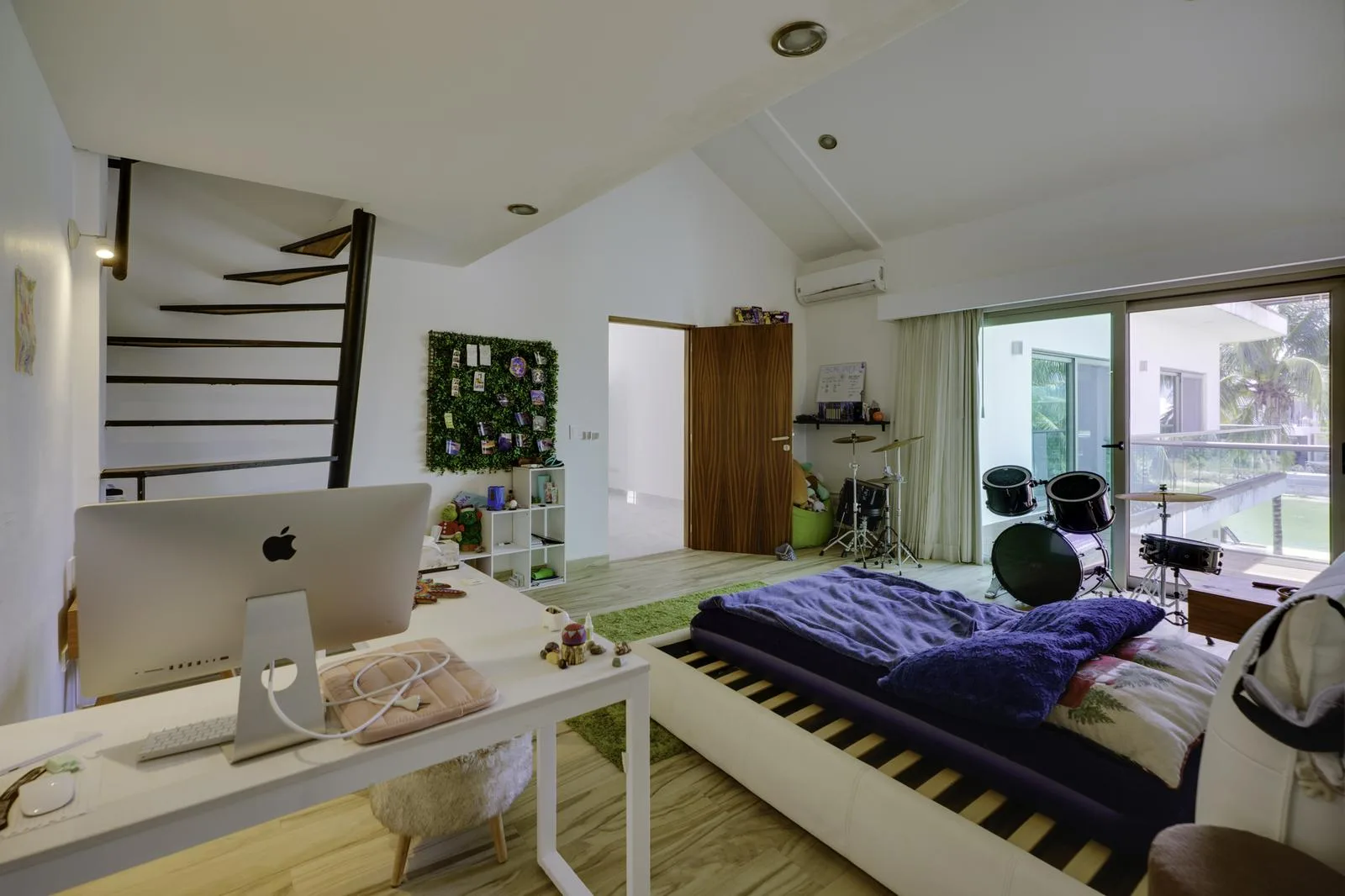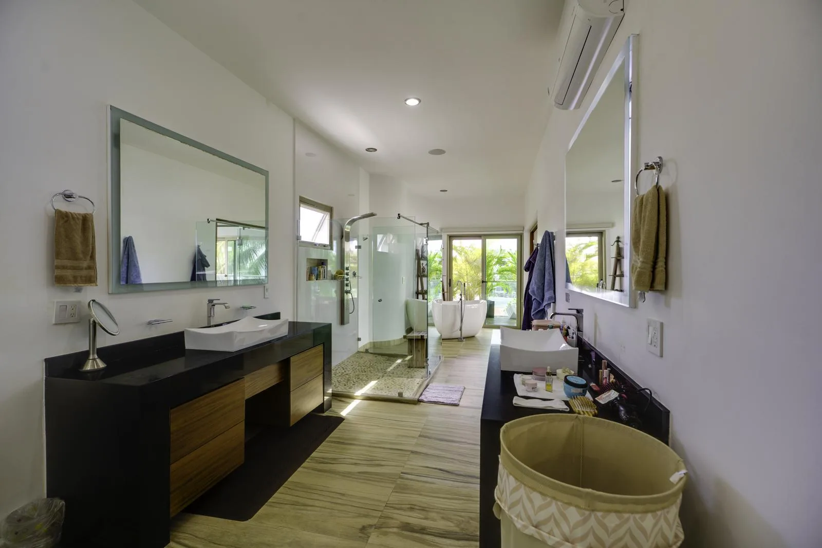 On the upper floor, the primary bedroom boasts a private terrace, a full bathroom with double sink, a tub, and a spacious walk-in closet. Two additional bedrooms each have a private bathroom, air conditioning, and terrace access. This floor also contains an office with a terrace, a family room, and an additional kitchenette.