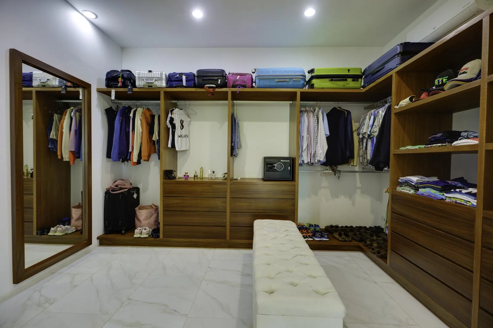 The residence occupies 970 square meters of land with 758 square meters of construction. It features covered parking for five vehicles, a half bathroom for drivers, and an elegant architectural design.