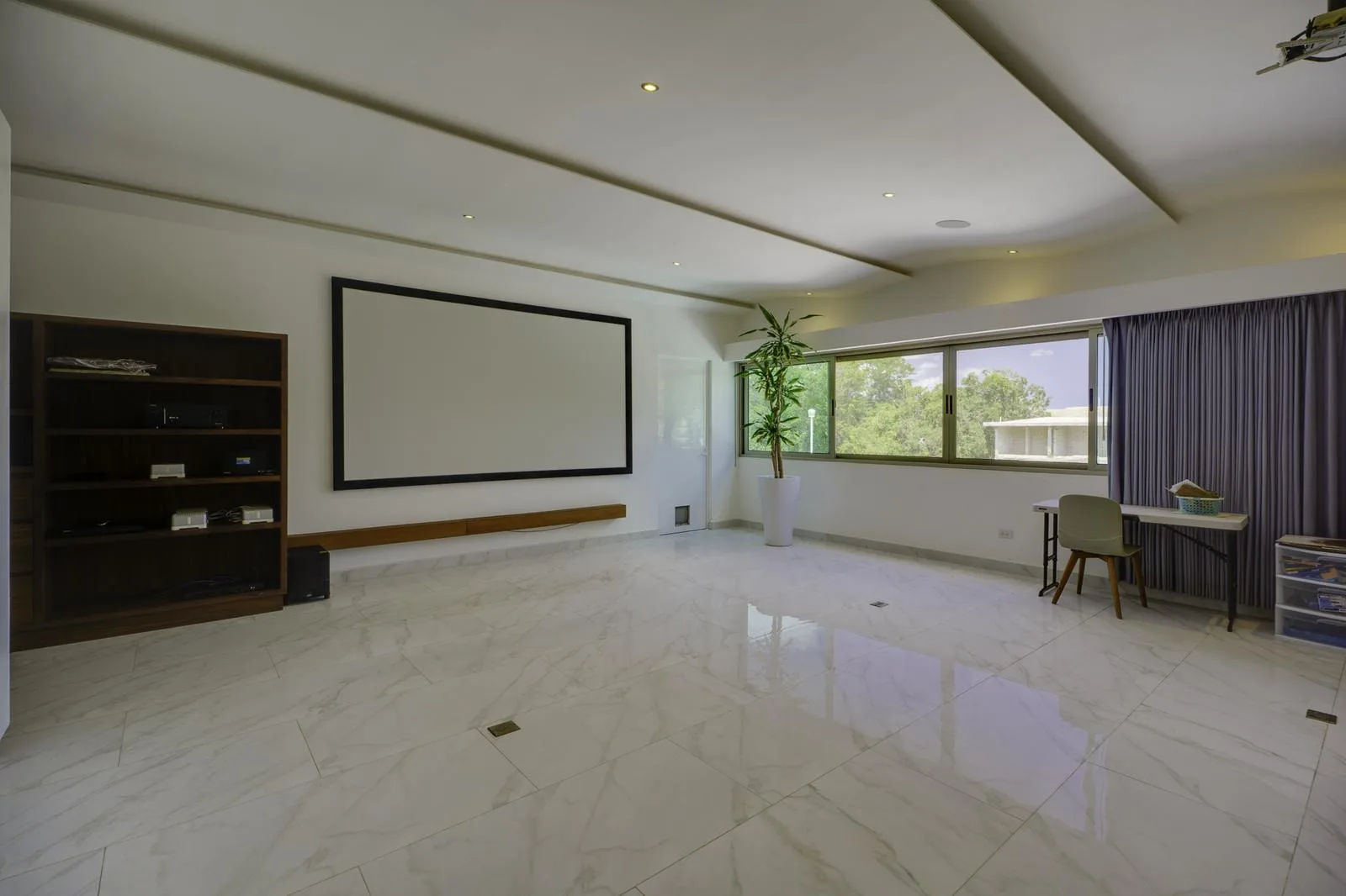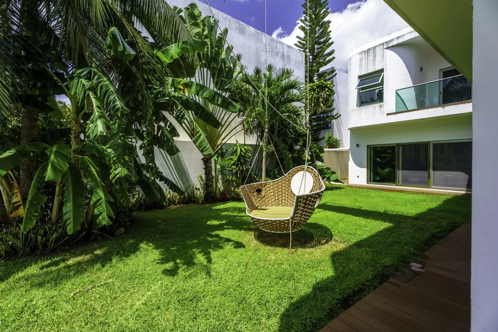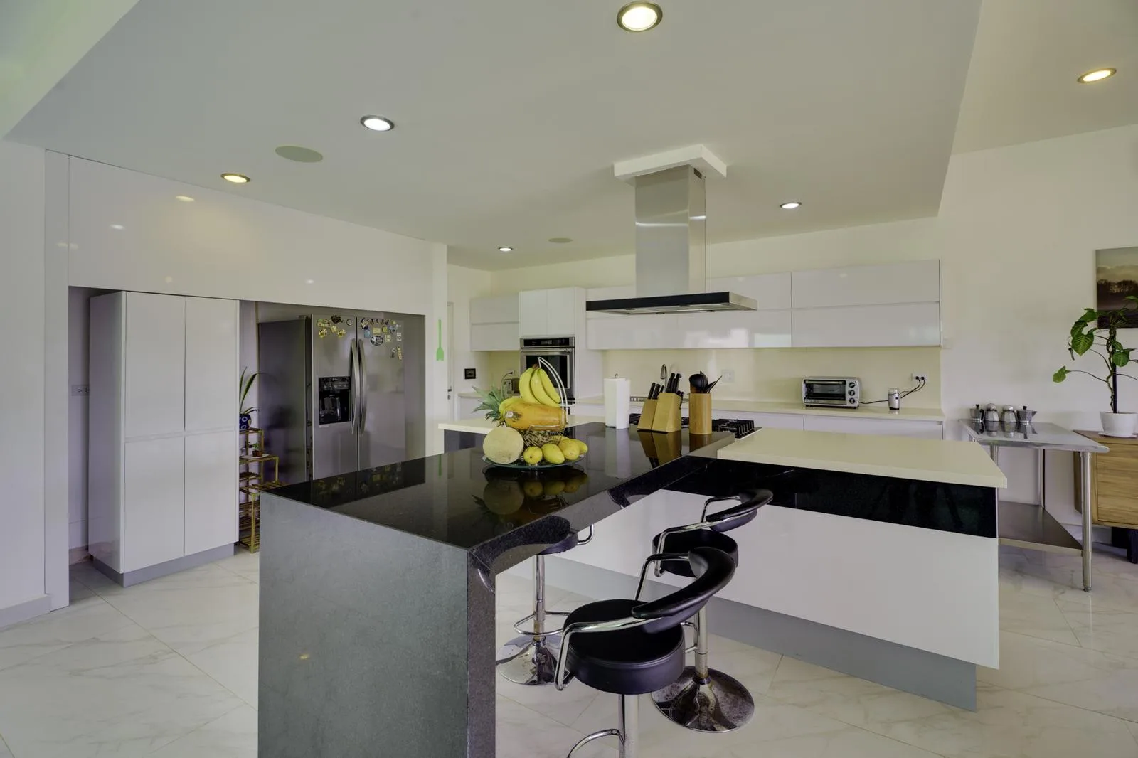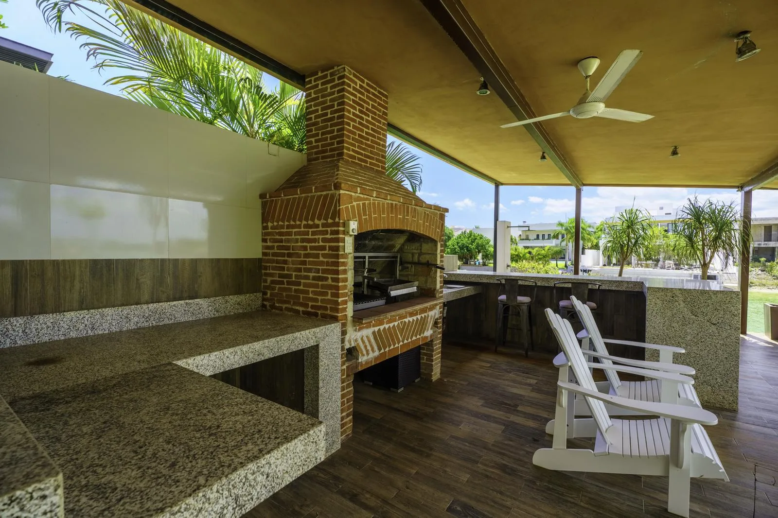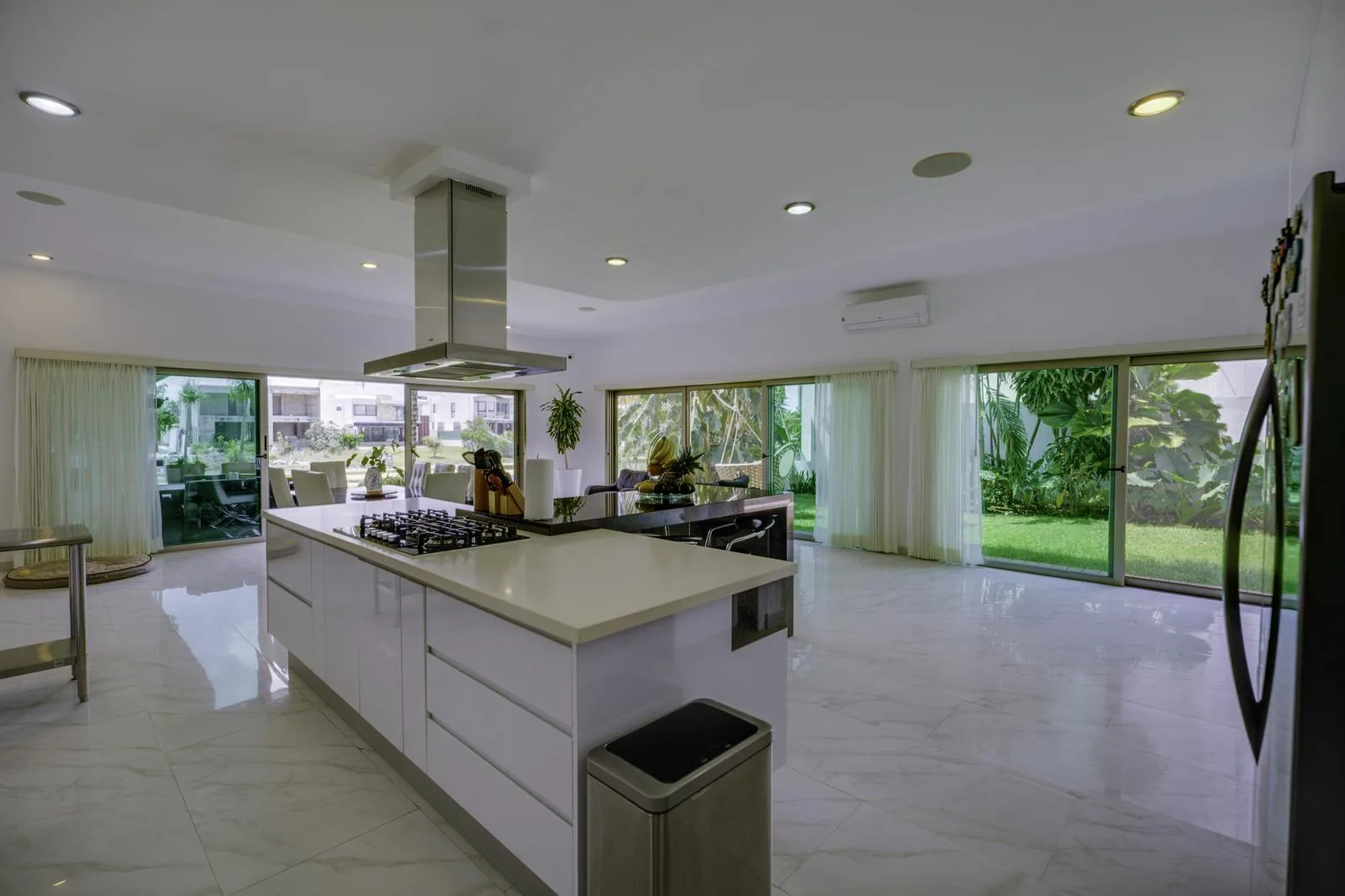 The ground floor includes independent living and dining rooms, a half bathroom for guests, and a kitchen equipped with a black granite bar and white quartz. Also on this level are a guest room with a private bathroom, a service room, a laundry area, and an outdoor area with a pool, garden, and a covered grill space.