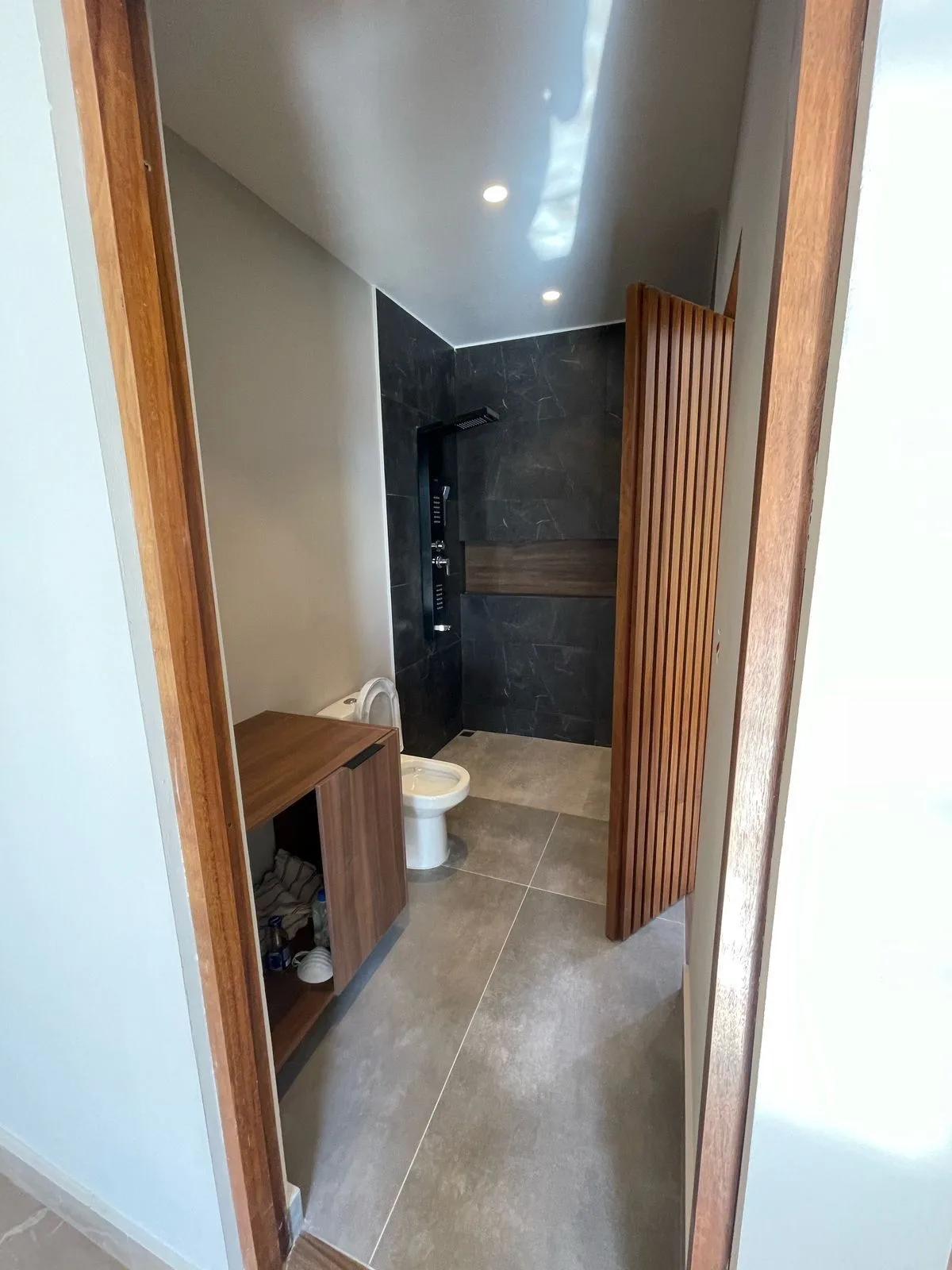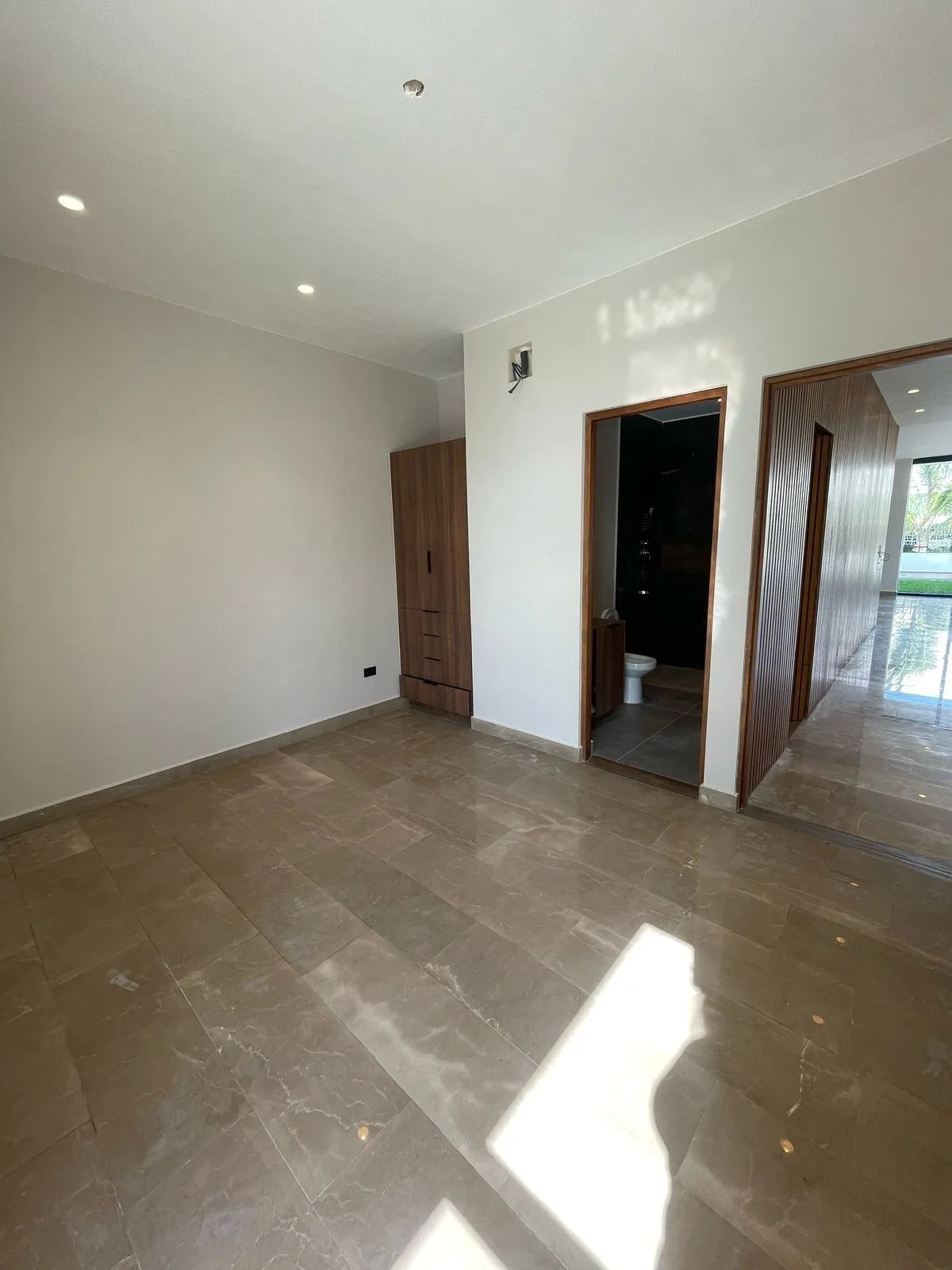 The first level contains the primary bedroom, which features a walk-in closet, a full bathroom, and a private gallery. Two secondary bedrooms each have a dressing area and independent access. This floor includes a TV room, an additional full bathroom, and terraces accessible from every bedroom, providing ventilation and a sense of visual spaciousness.