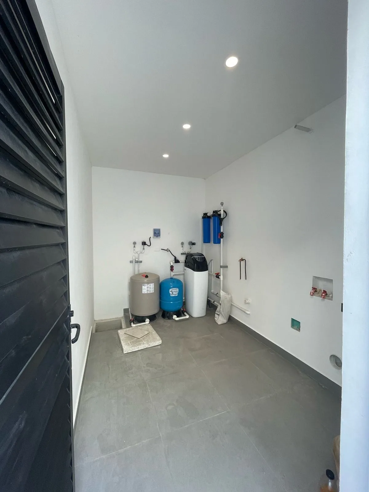 A private study serves as a home office or multifunctional area. The ground floor also includes a laundry room, a service room with a full bathroom, and a linen closet. The terrace is equipped with a sun deck and a low pool.