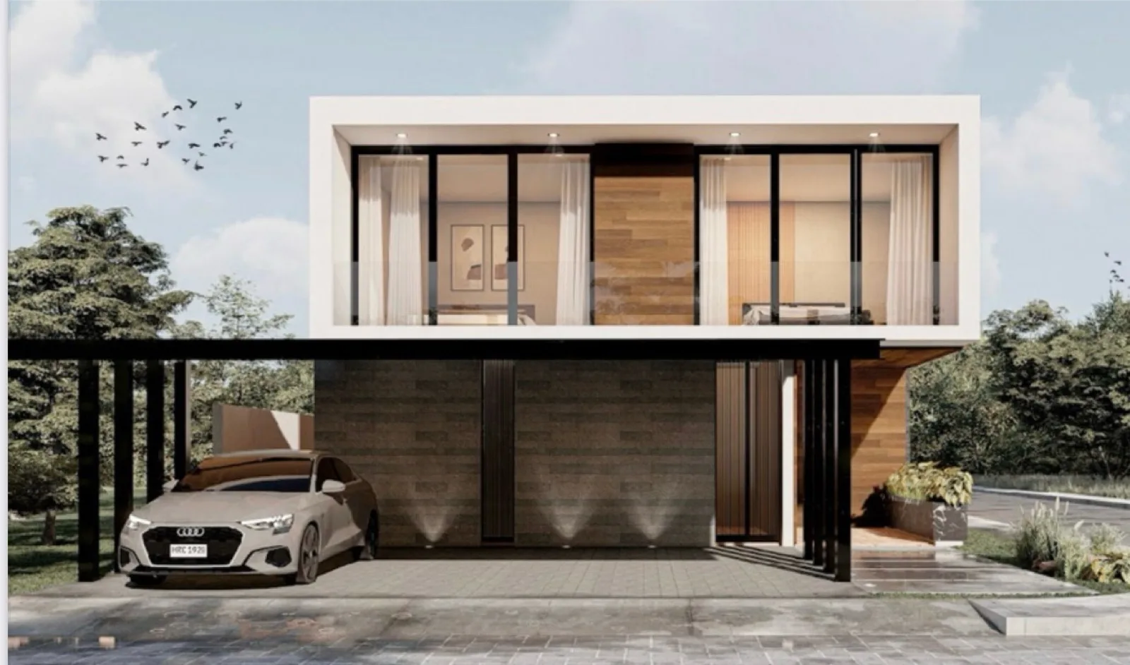 This modern design residence emphasizes spacious areas, privacy, and a layout that facilitates daily life. The home conveys order and functionality, with a natural connection between indoor and outdoor areas creating a comfortable environment for family living and entertaining.