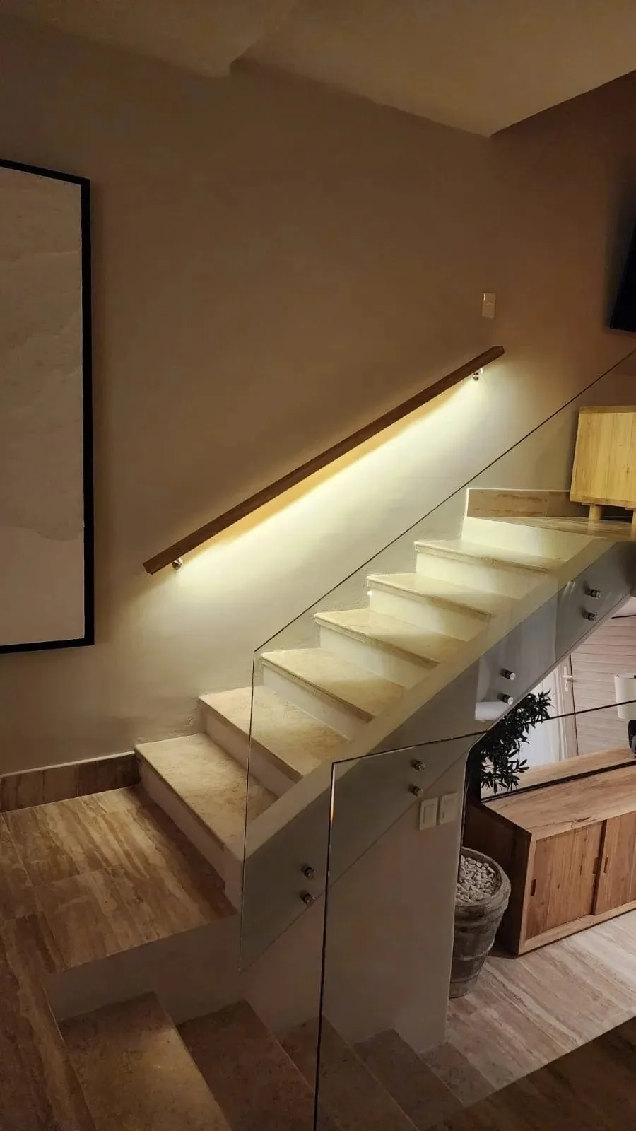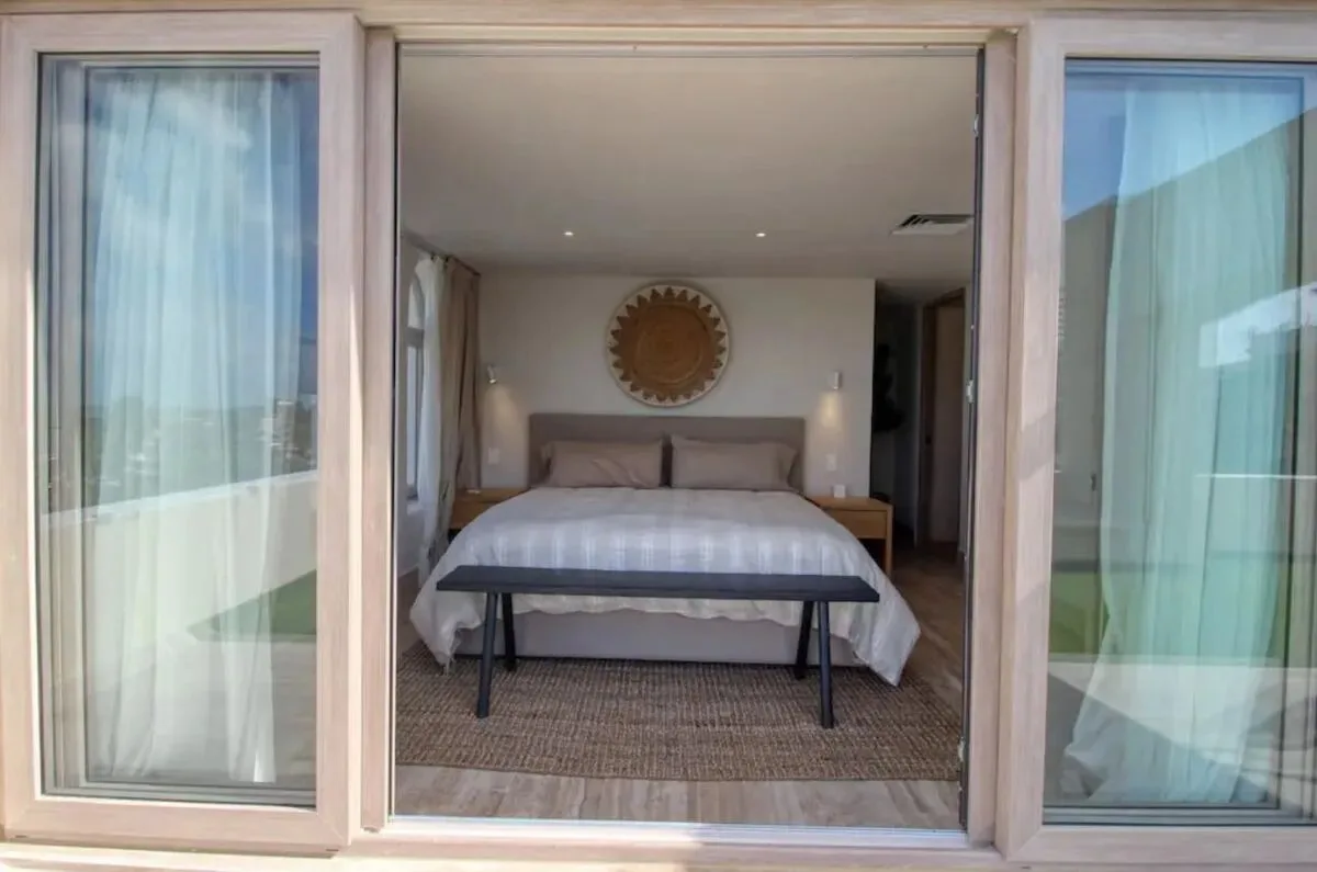 The house features a modern design with high-quality finishes. It includes four spacious bedrooms, comfortably designed for up to ten people, with one king-size bed and four queen-size beds. Each bedroom has a complete private bathroom and integrated closet. An additional guest bathroom is provided for convenience.